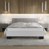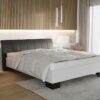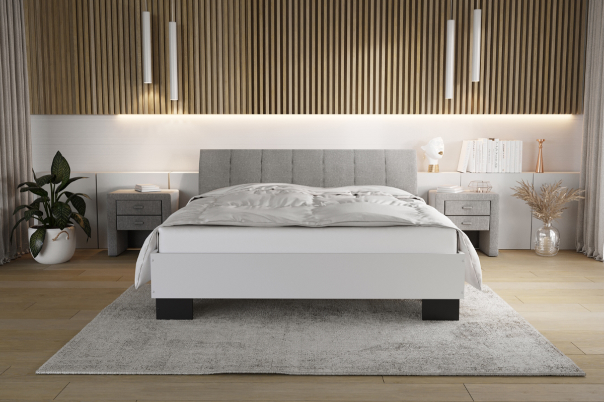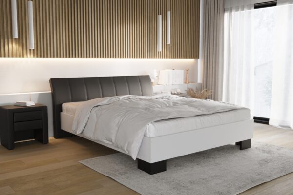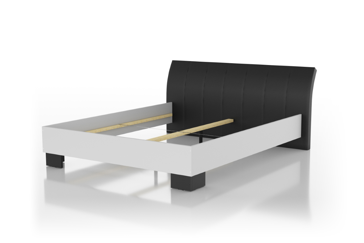 Klasyczne łóżko zbudowane z płyty w białej okleinie. Wygodne podparcie zapewnia szeroki zagłówek tapicerowany w obiciu skóropodobnym lub z tkaniny meblowej do wyboru z szerokiej gamy kolorystycznej. Stabilnie stoi na szerokich nóżkach w różnych wybarwieniach. Poza standardowymi wymiarami, łóżko jest dostępne również w nietypowej długości i szerokości.