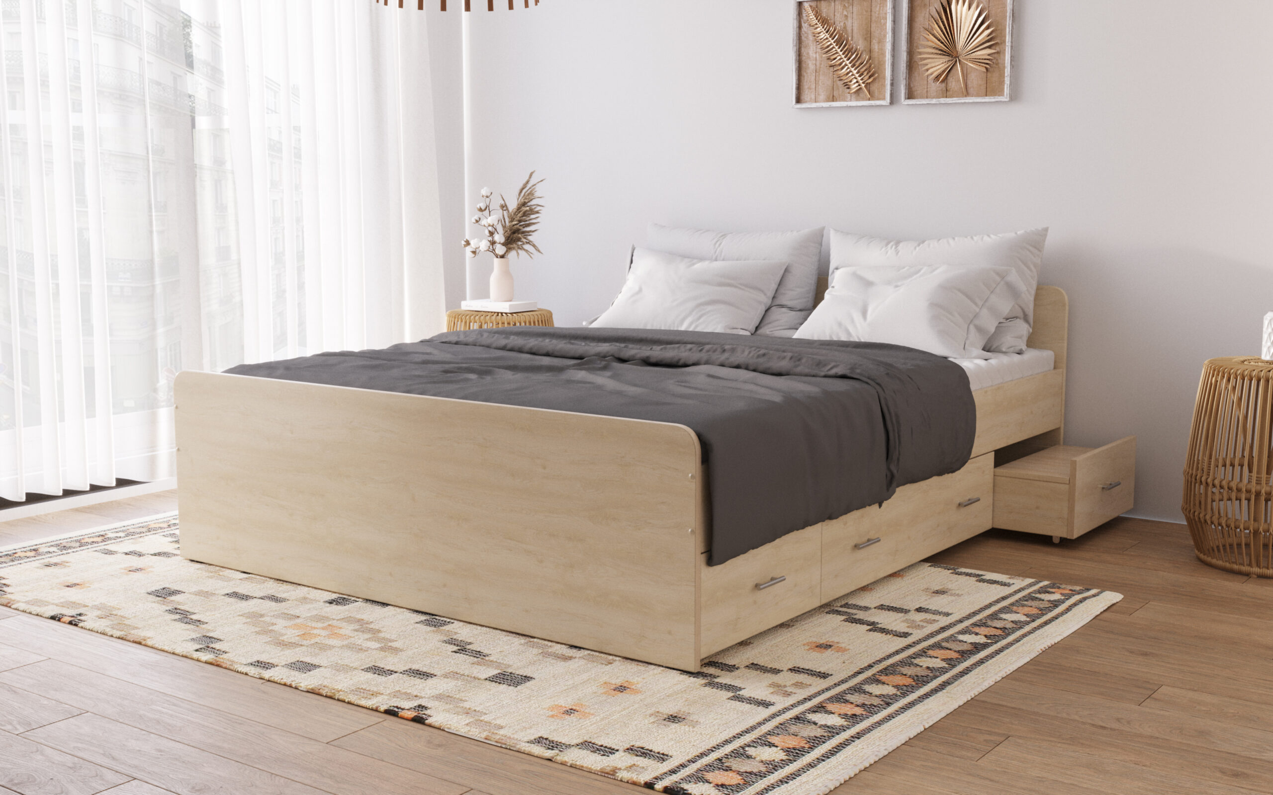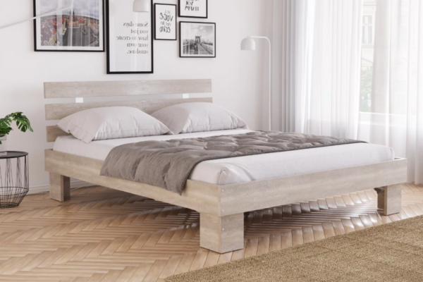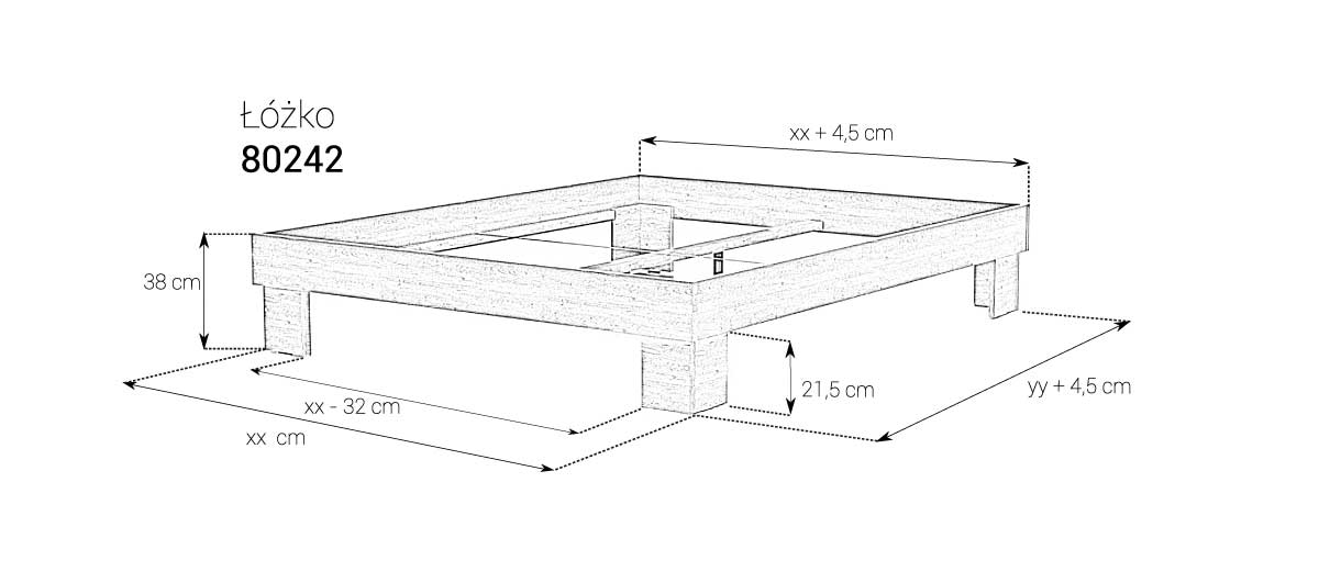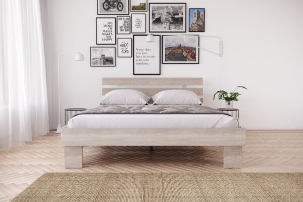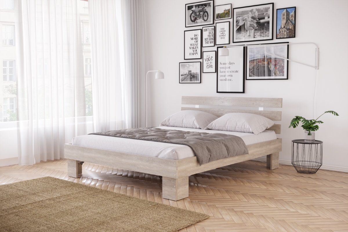 Klasyczne, minimalistyczne łóżko zbudowane z płyty w okleinie kolorowej lub drewnopodobnej. Na życzenie klienta istnieje możliwość montażu nowoczesnego zagłówka w kolorze łóżka. Stabilnie stoi na prostych nóżkach w różnych wybarwieniach. Poza standardowymi wymiarami, łóżko jest dostępne również w nietypowej długości i szerokości. Dodatkowo do nabycia szafka nocna.