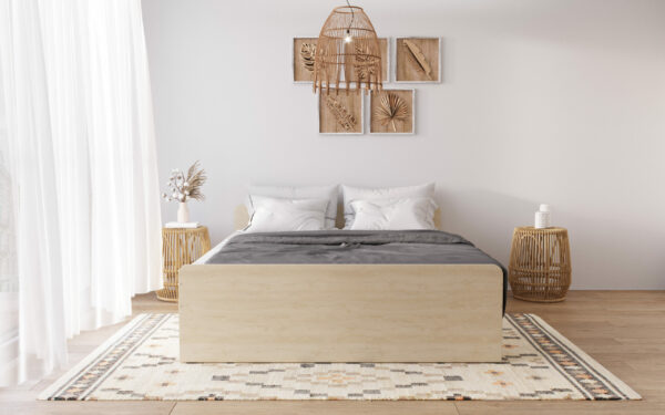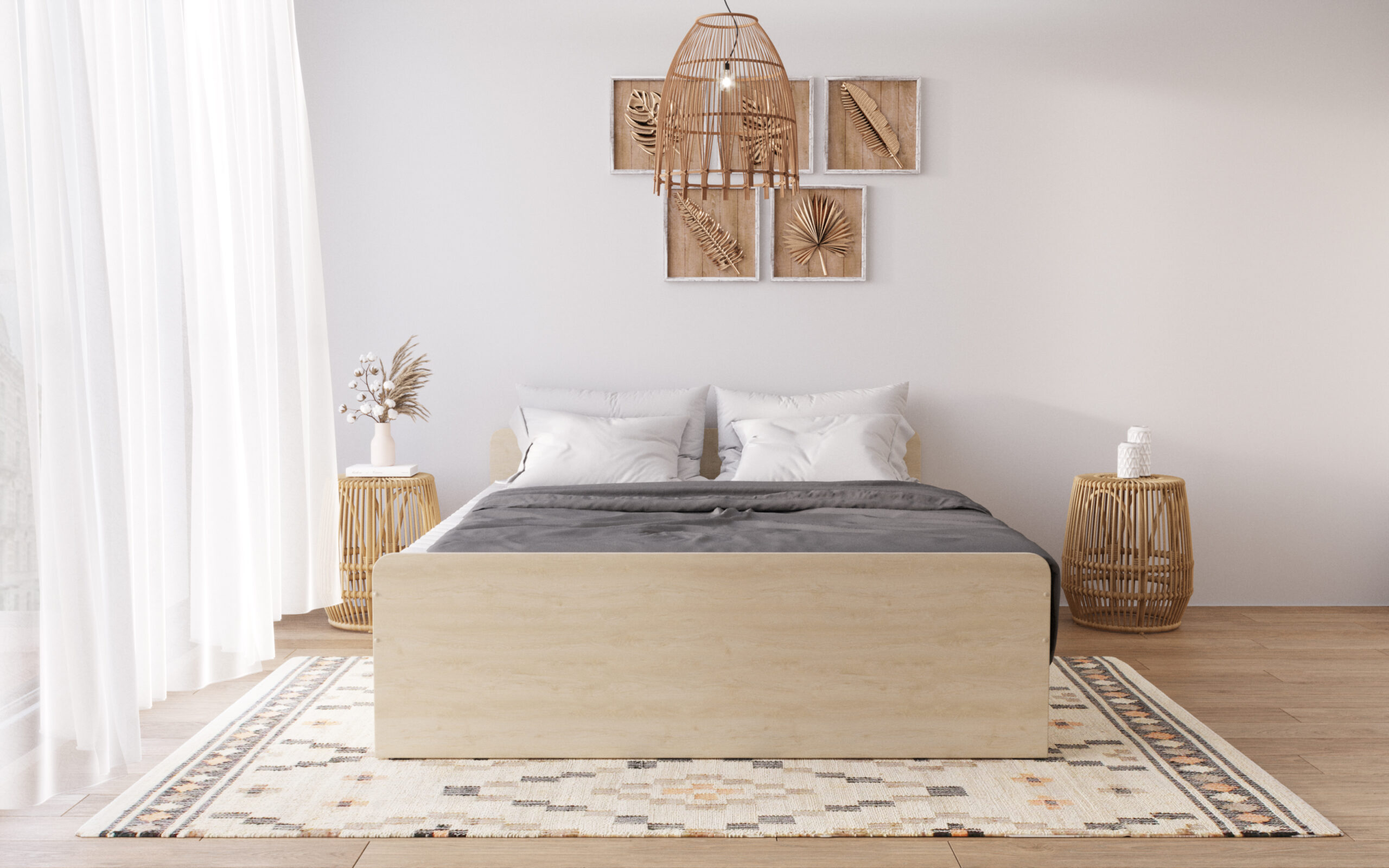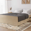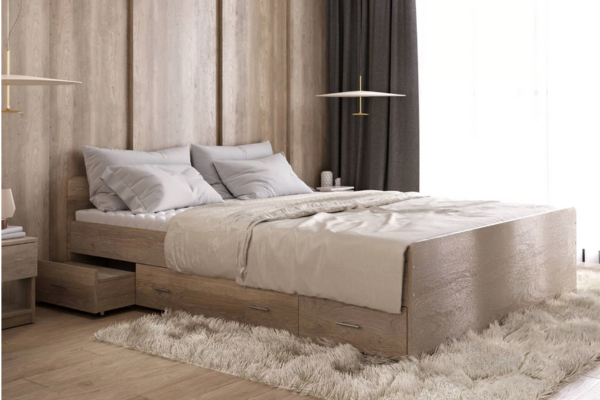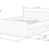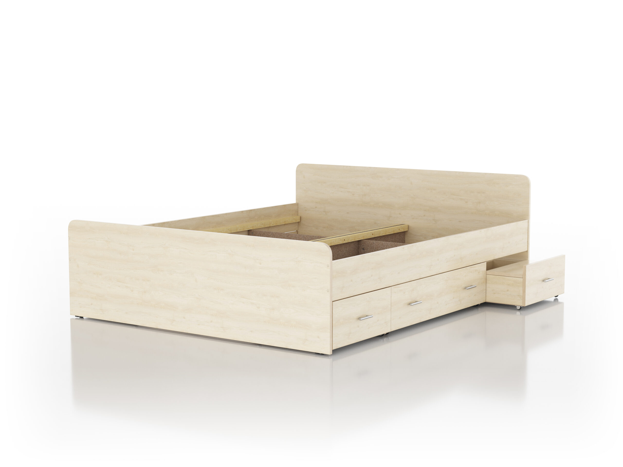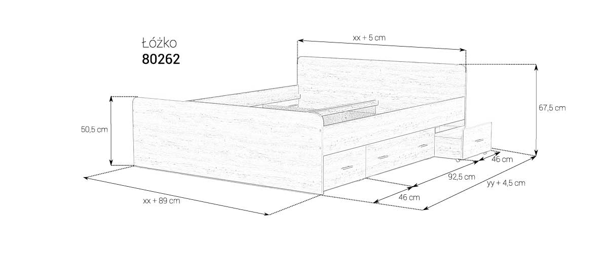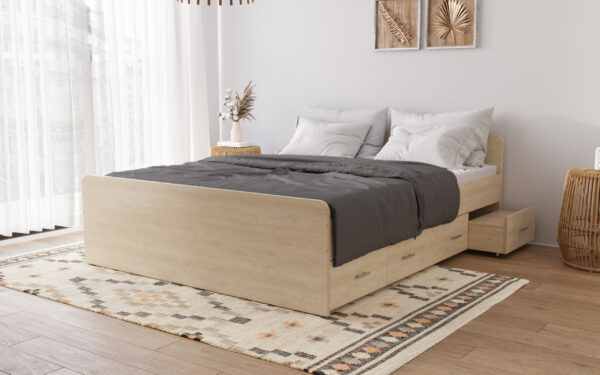 Proste, wysokie łóżko zbudowane z płyty w okleinie kolorowej lub drewnopodobnej. Posiada trzy pojemne szuflady, a modele o szerokości 140 cm i szersze wyposażone zostały w sześć szuflad. Stanowi praktyczne rozwiązanie w niewielkich sypialniach, umożliwia przechowywanie pościeli.