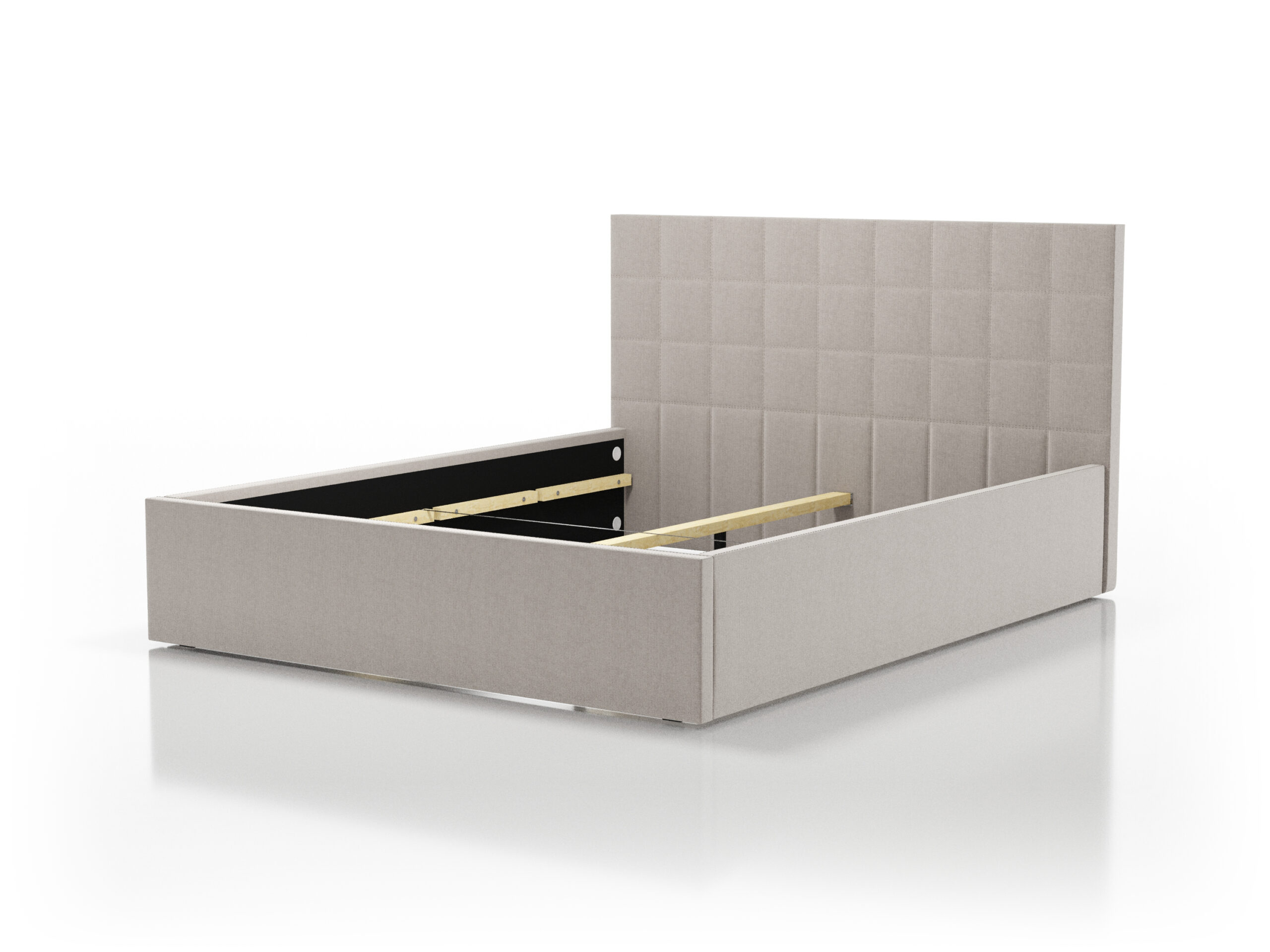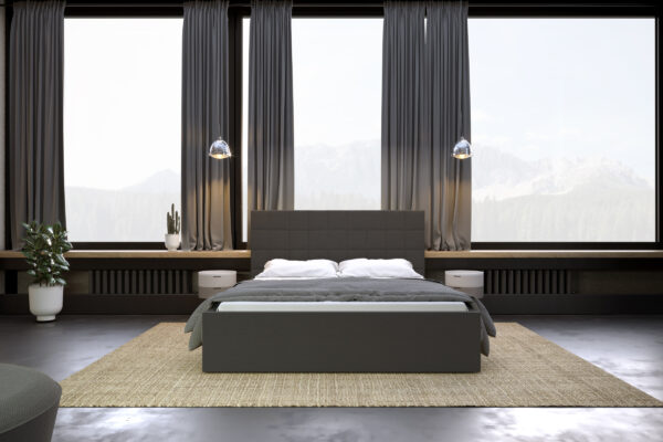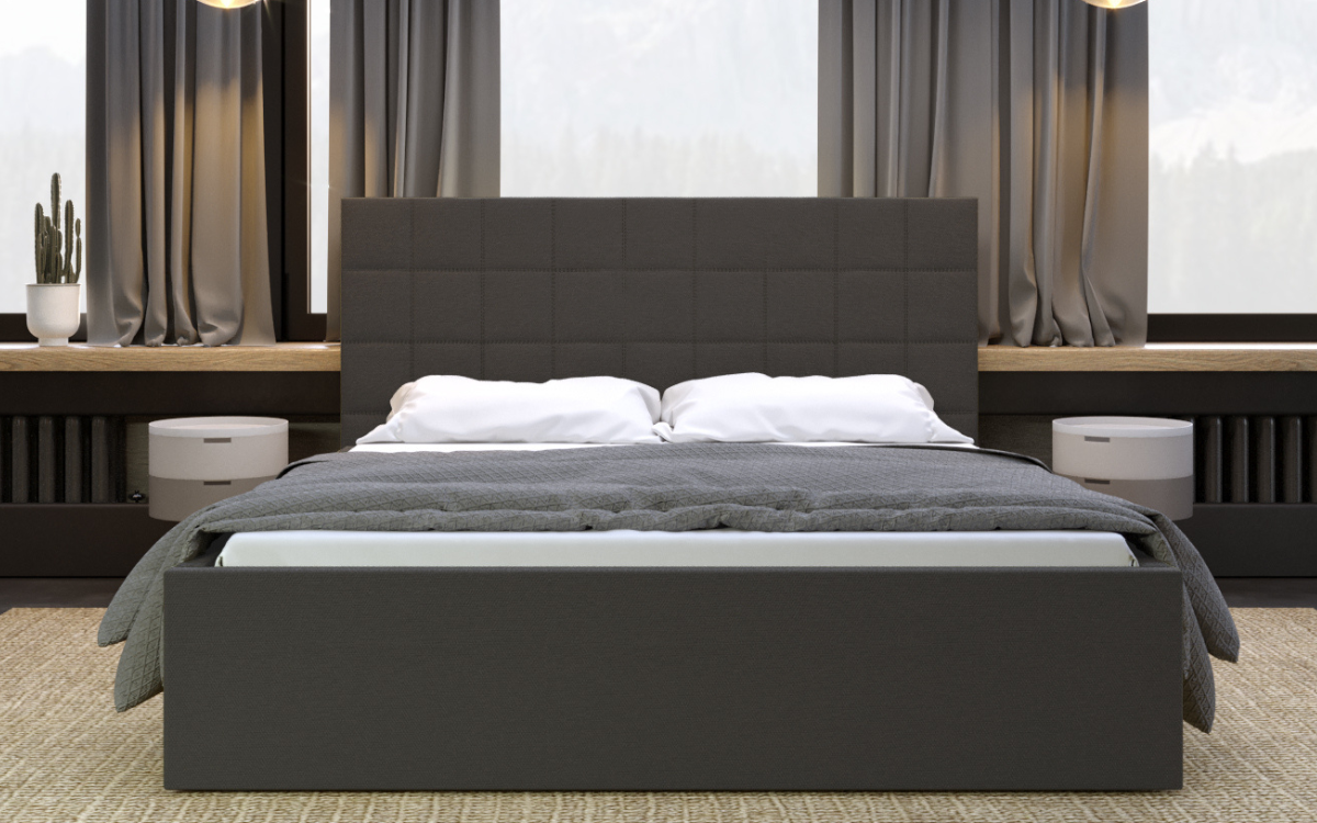 Geometryczne łóżko tapicerowane o prostej, klasycznej konstrukcji, którego rama oraz zagłówek tworzą ciekawą kompozycję. W łóżku zastosowano efektowne przeszycia. Doskonale sprawdzi się w każdym typie sypialni, ubogacając ją urodą prostej linii. Konstrukcja z płyty w obiciu z tkaniny meblowej, w szerokiej gamie kolorystycznej. Możliwość zastosowania pojemnika na pościel ze stelażem na ramie drewnianej lub metalowej. Poza standardowymi wymiarami, łóżko jest dostępne również w nietypowej długości. Za dodatkową opłatą zagłówek można otapicerować w tylnej części. Dla uzyskania pełnego zadowolenia klienta zalecamy odpowiedni stelaż i materac z naszej oferty.
