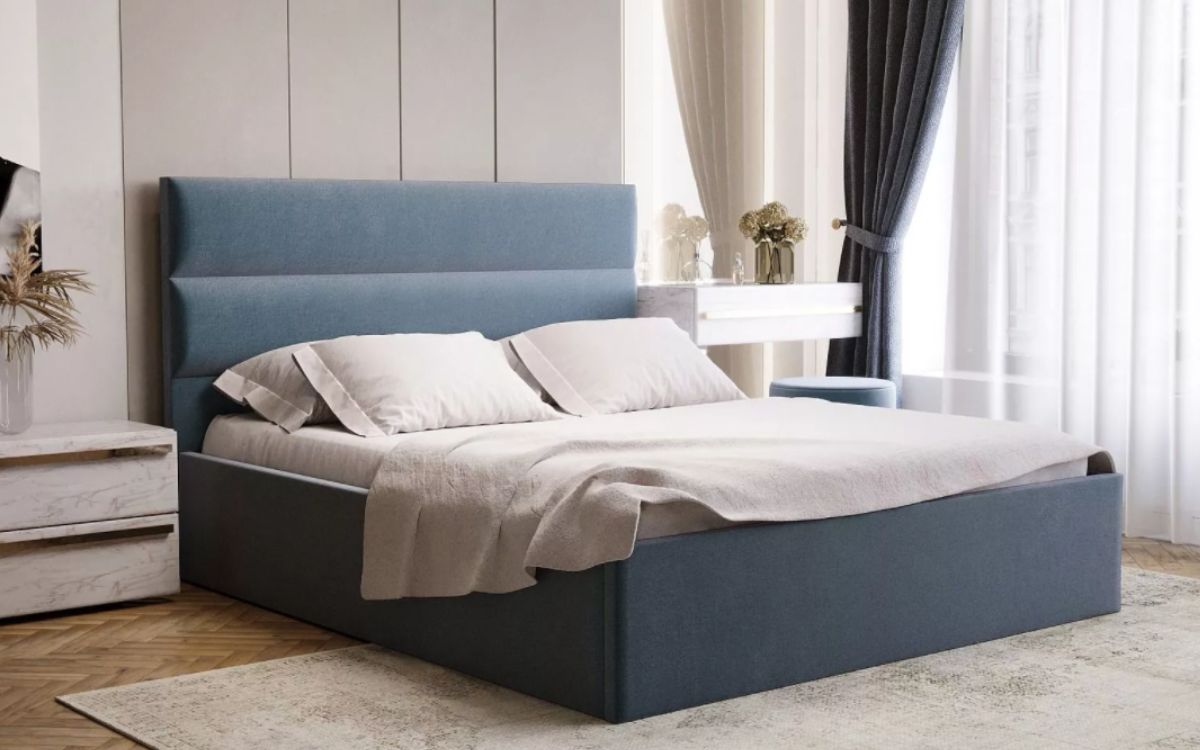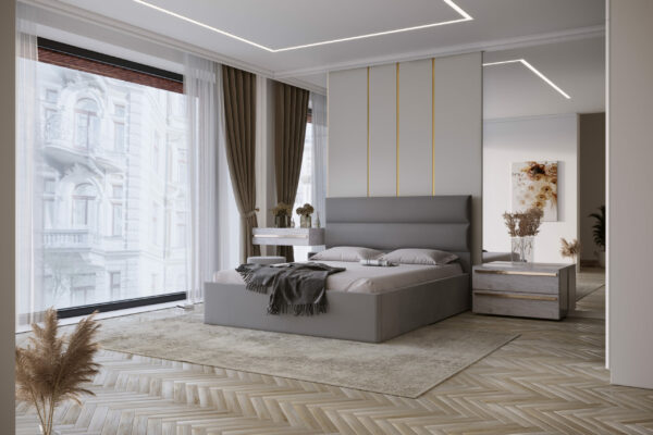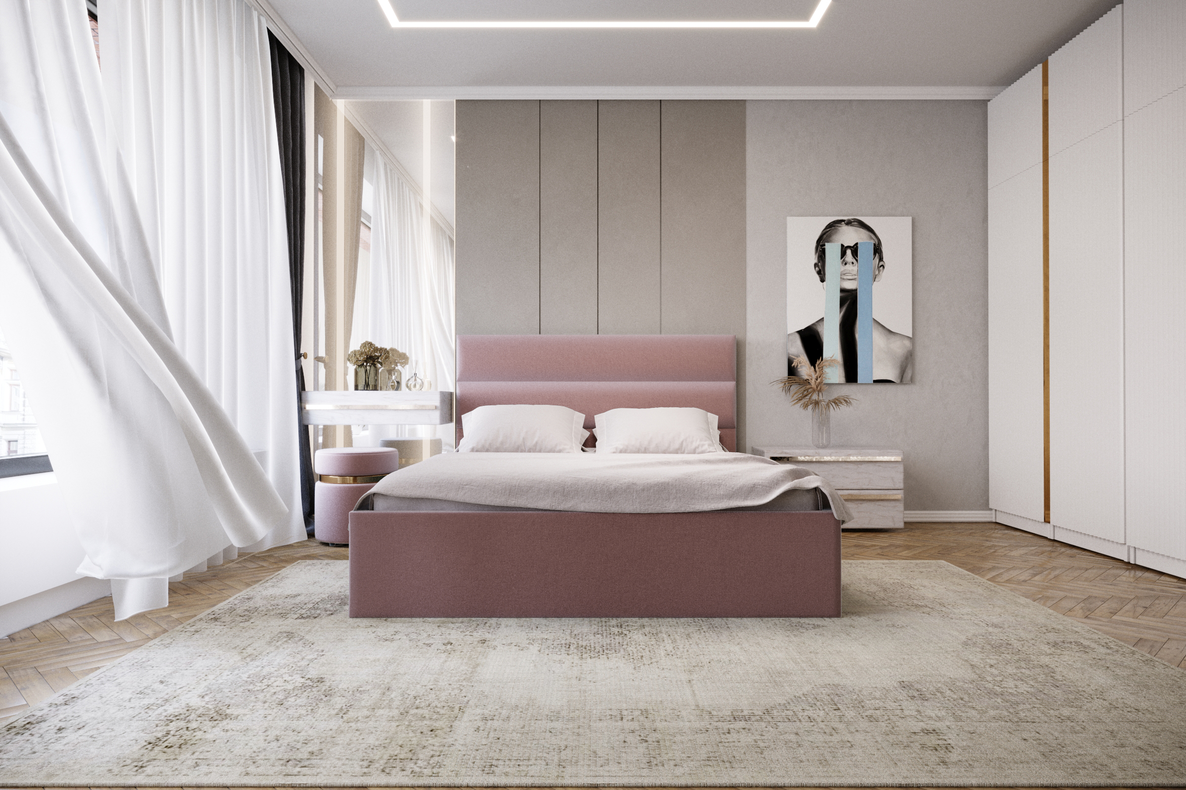 Delikatne łóżko tapicerowane o prostej, klasycznej konstrukcji tworzy ciekawą kompozycję. W łóżku zastosowano efektowne przeszycia. Doskonale sprawdzi się w każdym typie sypialni, ubogacając ją urodą prostej linii. Łóżko z płyty w obiciu z tkaniny meblowej, w szerokiej gamie kolorystycznej. Możliwość zastosowania pojemnika na pościel ze stelażem na ramie drewnianej lub metalowej. Poza standardowymi wymiarami, łóżko jest dostępne również w nietypowej długości. Za dodatkową opłatą zagłówek można otapicerować w tylnej części. Dla uzyskania pełnego zadowolenia klienta zalecamy odpowiedni stelaż i materac z naszej oferty.