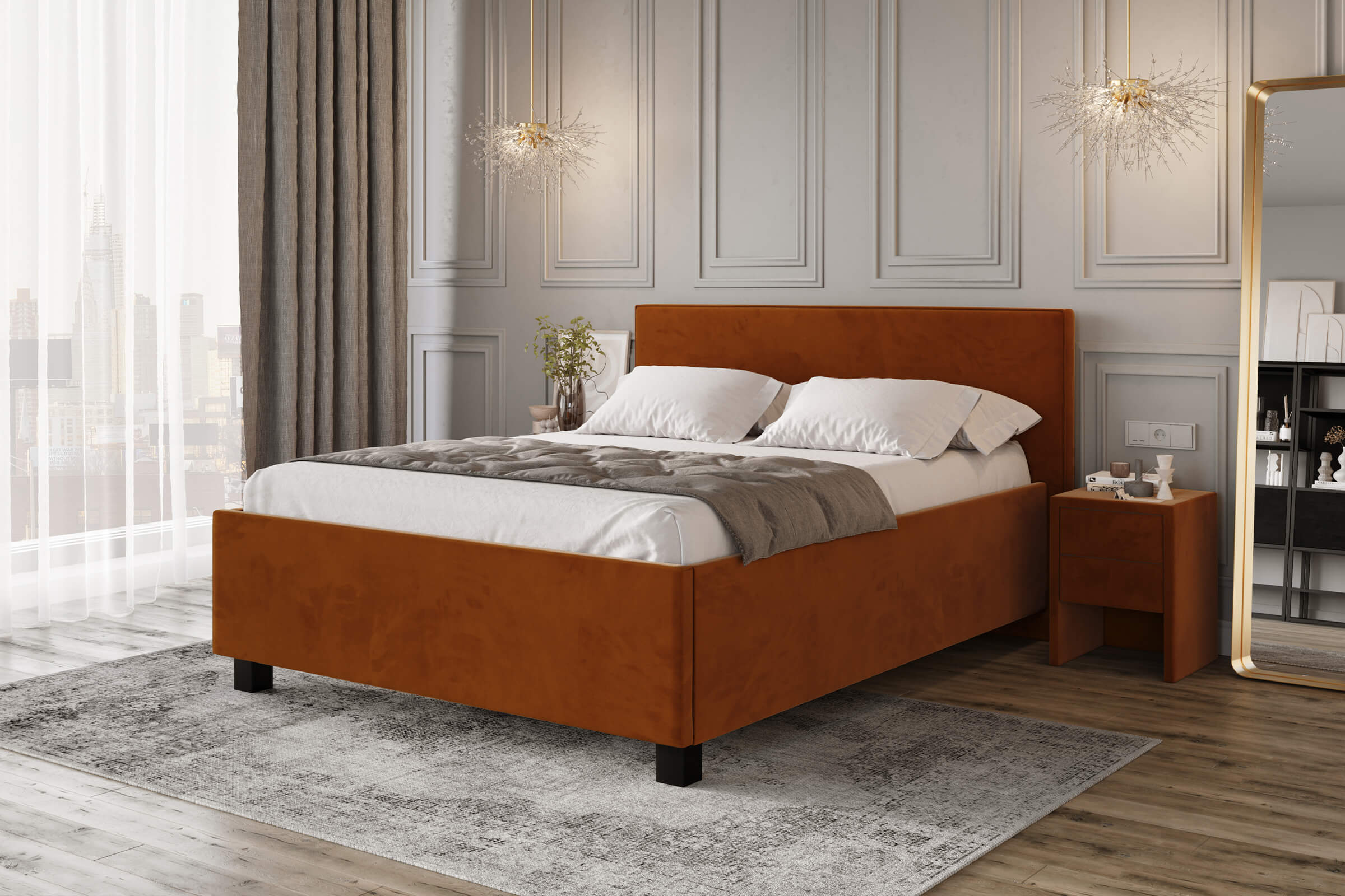 Oryginalne łóżko tapicerowane w stylu retro, o prostej konstrukcji charakteryzującej się wąską, otapicerowaną ramą łóżka z ciekawie wykończonym zagłówkiem. Łóżko dla osób poszukujących niebanalnych rozwiązań. Idealnie pasuje do przestronnych wnętrz stylizowanych na retro lub nowoczesnych. Łóżko z litego drewna w obiciu z tkaniny meblowej, w szerokiej gamie kolorystycznej. Do wyboru cztery wybarwienia nóg drewnianych w kolorach brąz, czarny, srebrny i naturalny. Poza standardowymi wymiarami, łóżko jest dostępne również w nietypowej długości i szerokości. Za dodatkową opłatą zagłówek można otapicerować w tylnej części. Dla uzyskania pełnego zadowolenia klienta zalecamy odpowiedni stelaż i materac z naszej oferty.