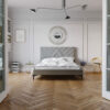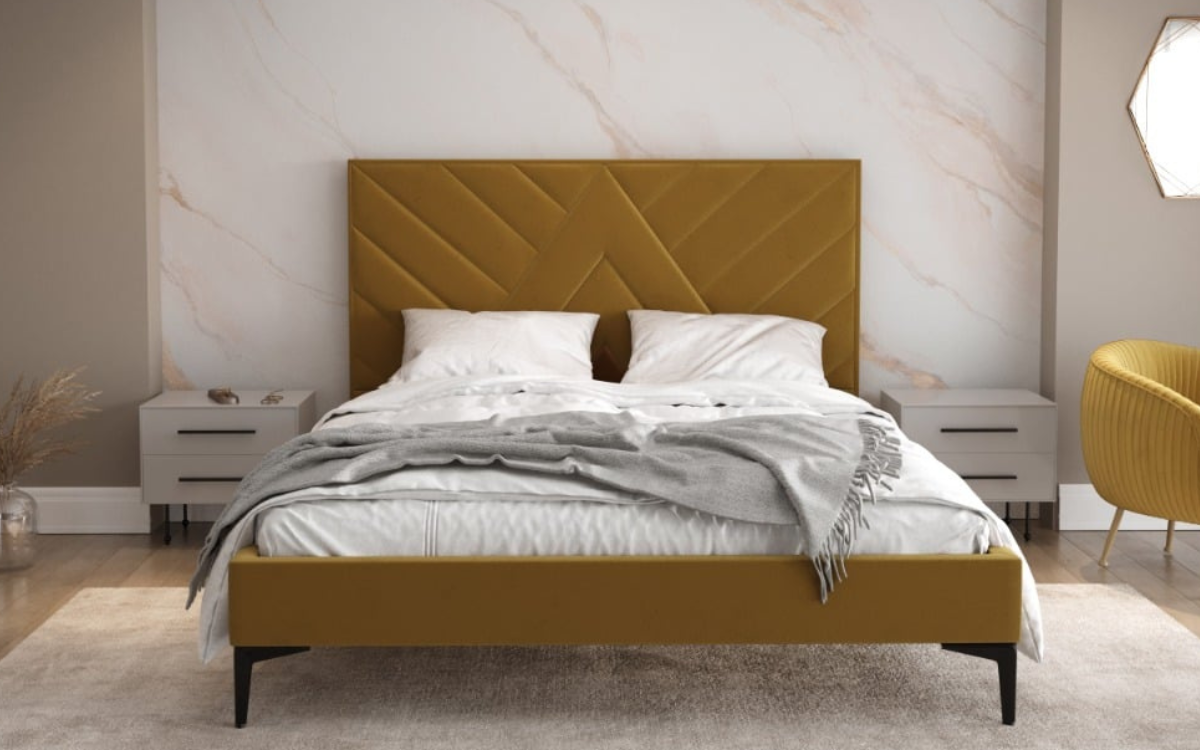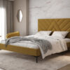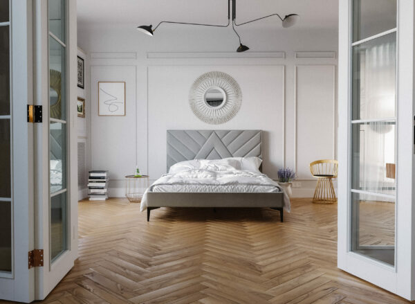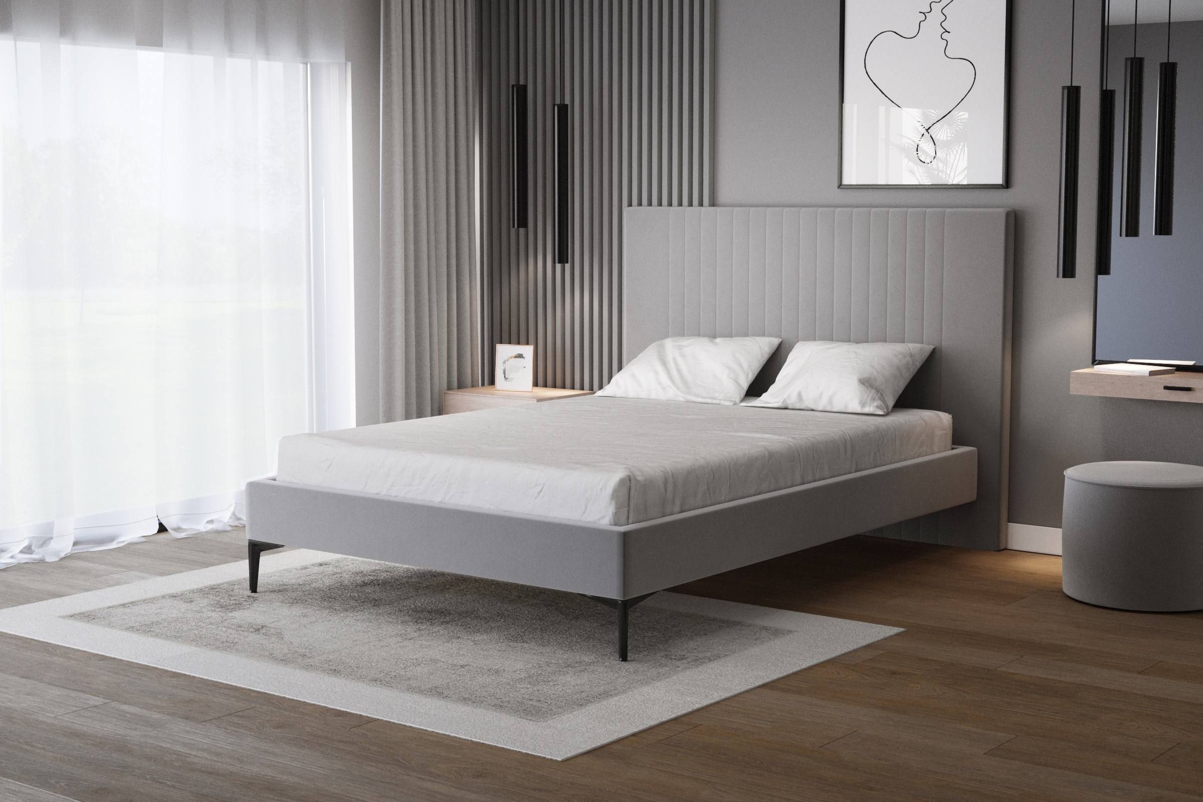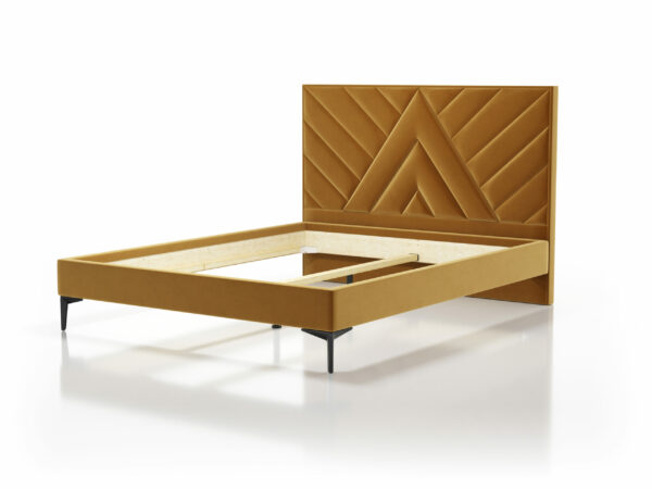 Nowoczesne, tapicerowane łóżko, którego prosta rama i wysoki zagłówek z charakterystycznymi, ukośnymi przeszyciami tworzą oryginalną kompozycję. Doskonale sprawdzi się zarówno w klasycznej, jak i nowoczesnej sypialni. Konstrukcja drewniana na zewnątrz obita jest tkaniną meblową w szerokiej gamie kolorystycznej, a w korpusie łóżka, od strony wewnętrznej, widoczne jest drewno. Za dodatkową opłatą zagłówek można otapicerować w tylnej części. Mebel stoi stabilnie na subtelnych metalowych nóżkach, które dają wrażenie delikatności i lekkości całej konstrukcji. Wzór nóżek do wyboru. Poza standardowymi wymiarami, łóżko jest dostępne również w nietypowej długości i szerokości. Istnieje możliwość wyboru wysokości mocowania listew podtrzymujących stelaż. Dla uzyskania pełnego zadowolenia klienta zalecamy odpowiedni stelaż i materac z naszej oferty. Rama łóżka jest zmontowana w całości, dzięki czemu zyskuje dodatkową stabilność. Większe gabaryty mogą zostać wykonane na indywidualne zamówienia. Należy się upewnić, czy będzie możliwe wniesienie łóżka do sypialni.