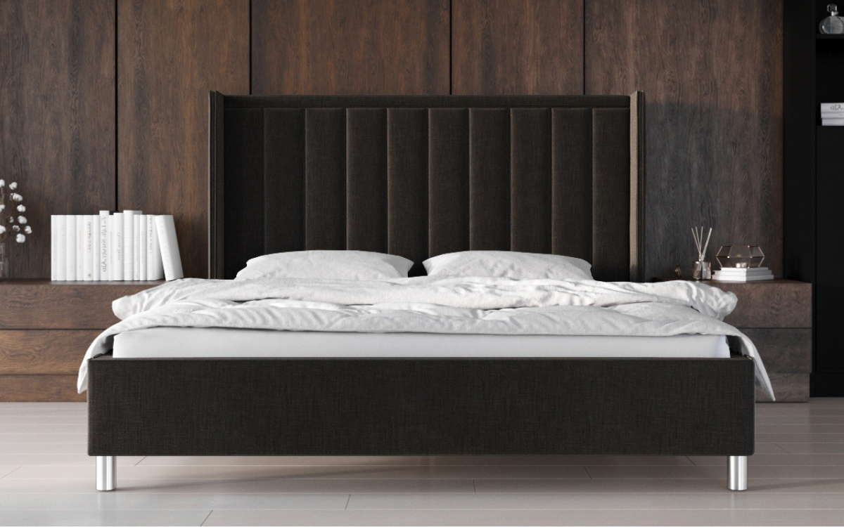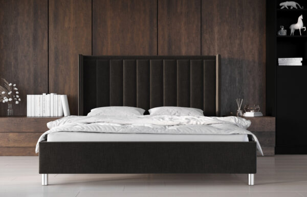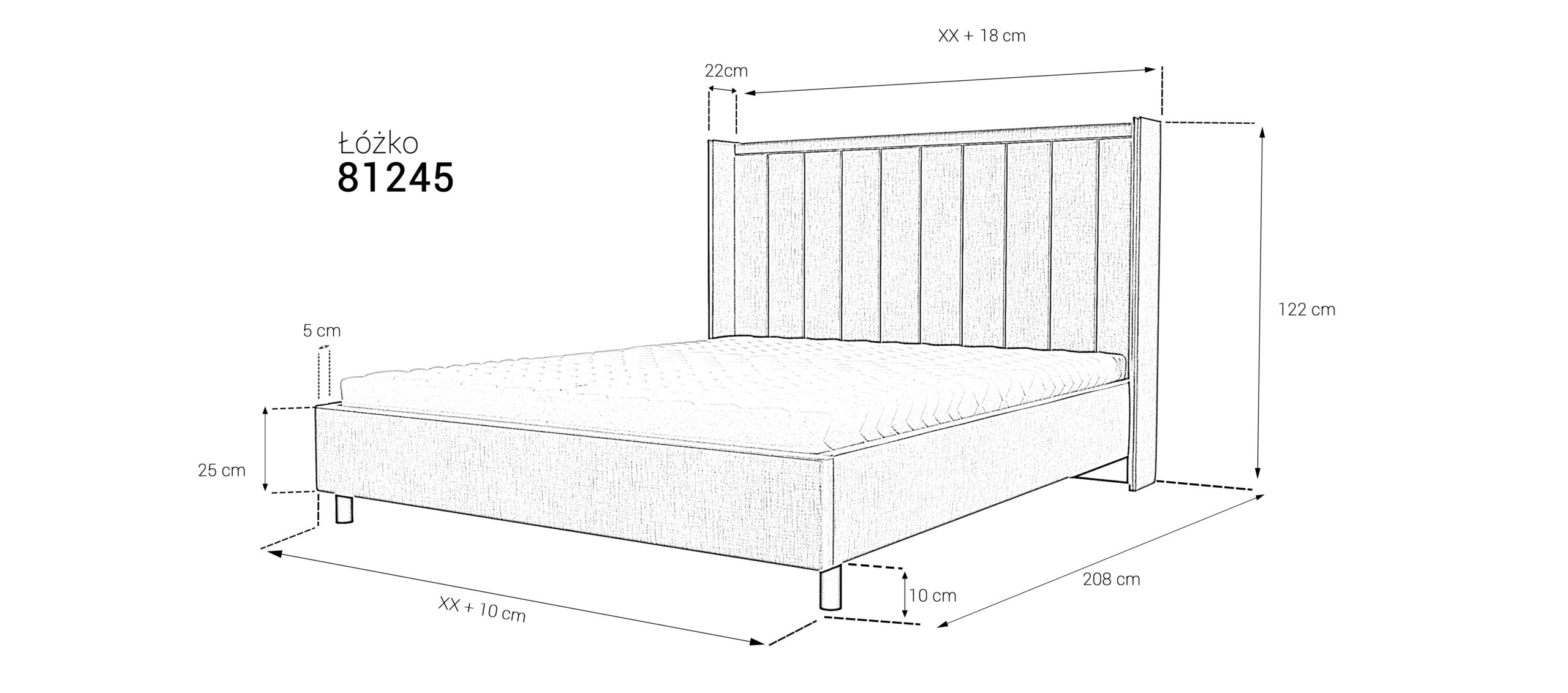Nowoczesne, tapicerowane łóżko, którego wytworny styl doda charakteru każdej sypialni. Prostą ramę zwieńcza wysoki zagłówek w formie pionowych paneli, symetrycznie obramowanych. Konstrukcja łóżka wykonana jest z płyty, a na zewnątrz obita jest tkaniną meblową w szerokiej gamie kolorystycznej. Mebel stoi stabilnie na okrągłych, chromowanych, plastikowych nogach. Poza standardowymi wymiarami, łóżko jest dostępne również w nietypowej długości i szerokości. Za dodatkową opłatą zagłówek można otapicerować w tylnej części. Dla uzyskania pełnego zadowolenia klienta zalecamy odpowiedni stelaż i materac z naszej oferty.