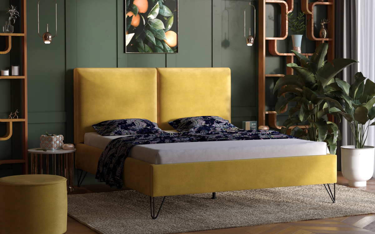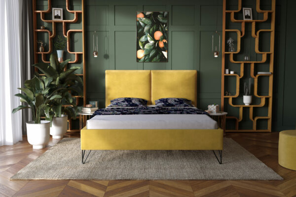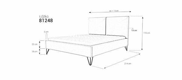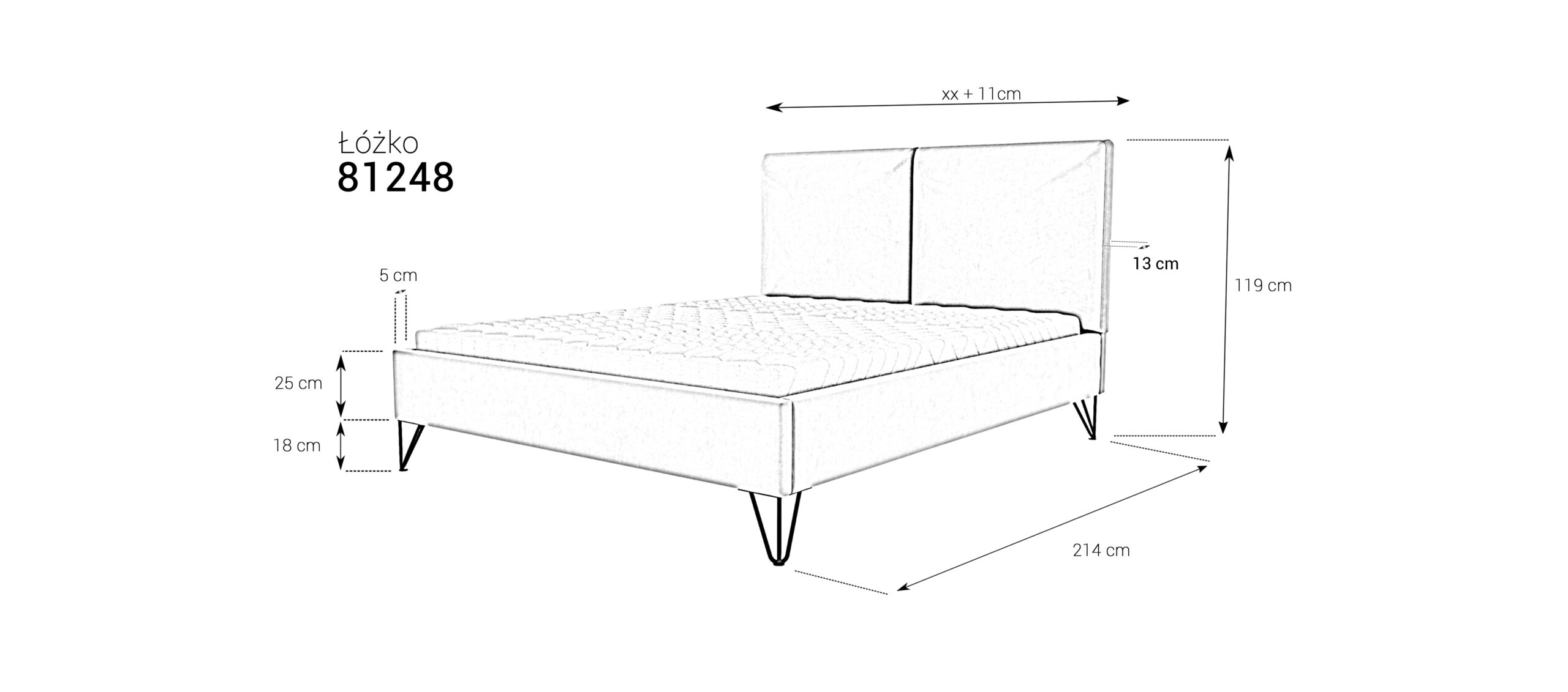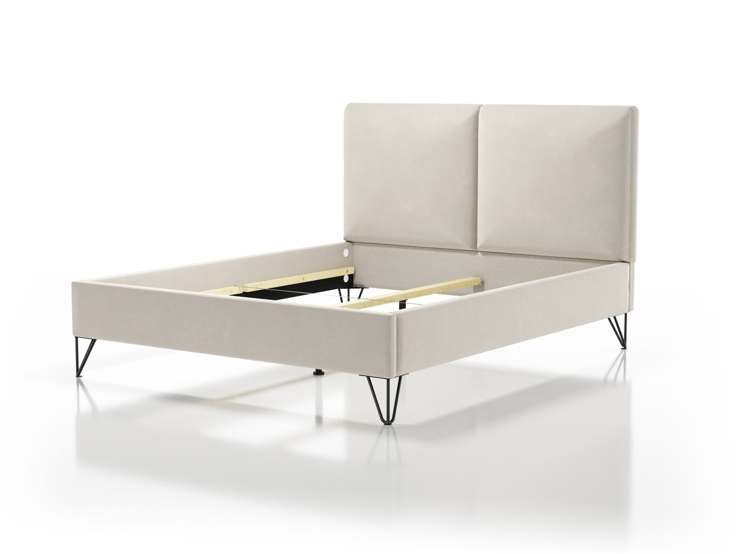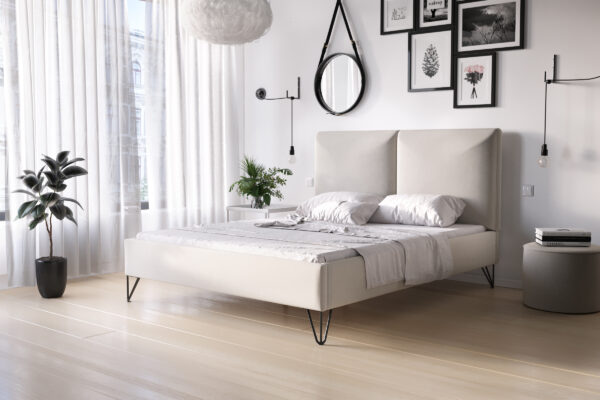 Nowoczesne, tapicerowane łóżko, którego prosta rama zwieńczona minimalistycznym zagłówkiem, zbudowanym z dwóch kwadratowych paneli, tworzą kompozycję idealną do stylowych, nowoczesnych wnętrz. Zagłówek jest mocowany do ramy łóżka, nie ma styczności z podłożem. Konstrukcja z płyty na zewnątrz obita jest tkaniną meblową w szerokiej gamie kolorystycznej. Mebel stoi stabilnie na subtelnych, wysmukłych nóżkach, które dają wrażenie delikatności i lekkości całej konstrukcji. Wzór nóżek do wyboru. Poza standardowymi wymiarami, łóżko jest dostępne również w nietypowej długości i szerokości. Za dodatkową opłatą zagłówek można otapicerować w tylnej części. Dla uzyskania pełnego zadowolenia klienta zalecamy odpowiedni stelaż i materac z naszej oferty.