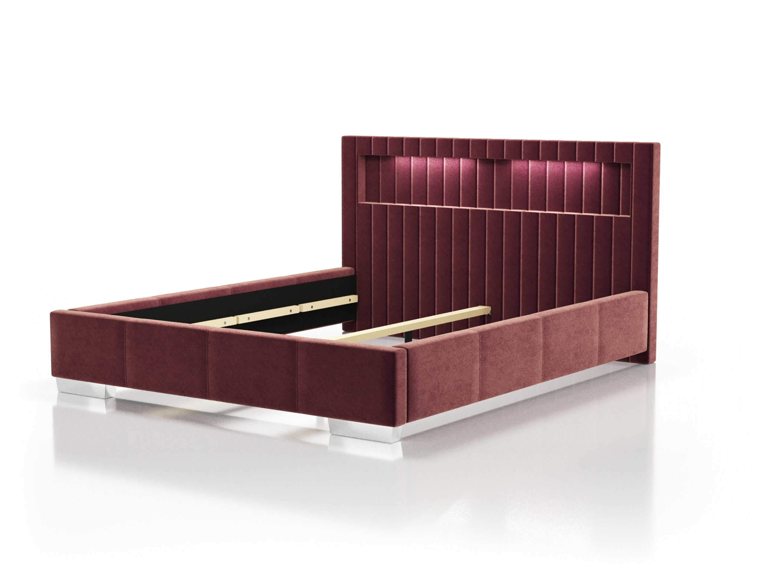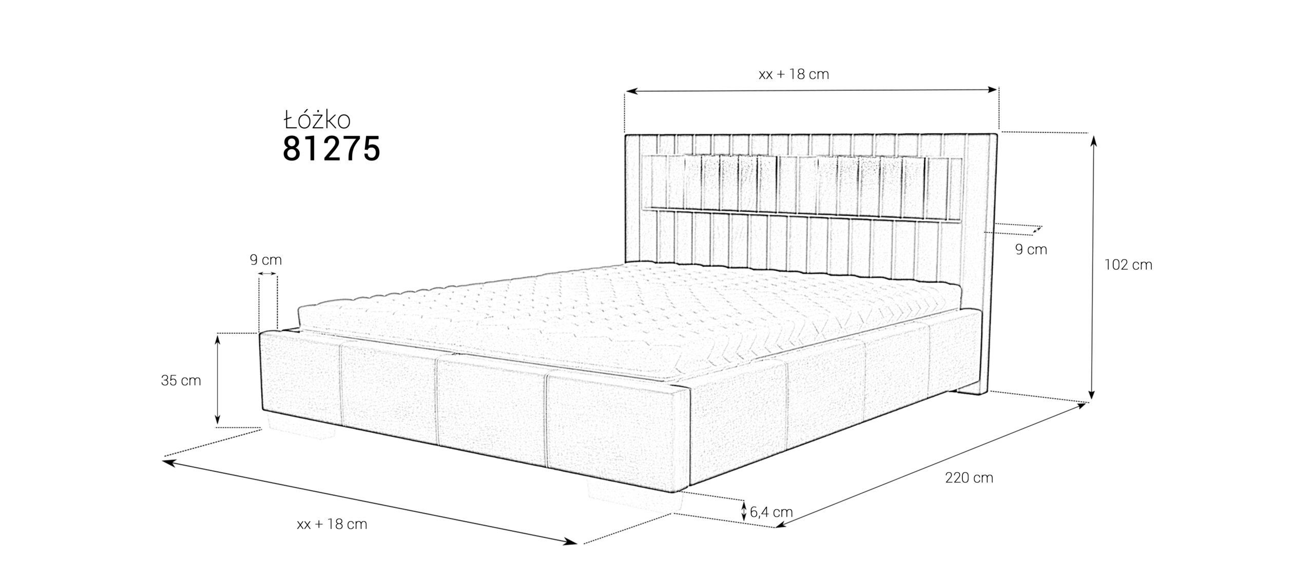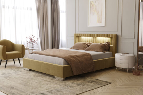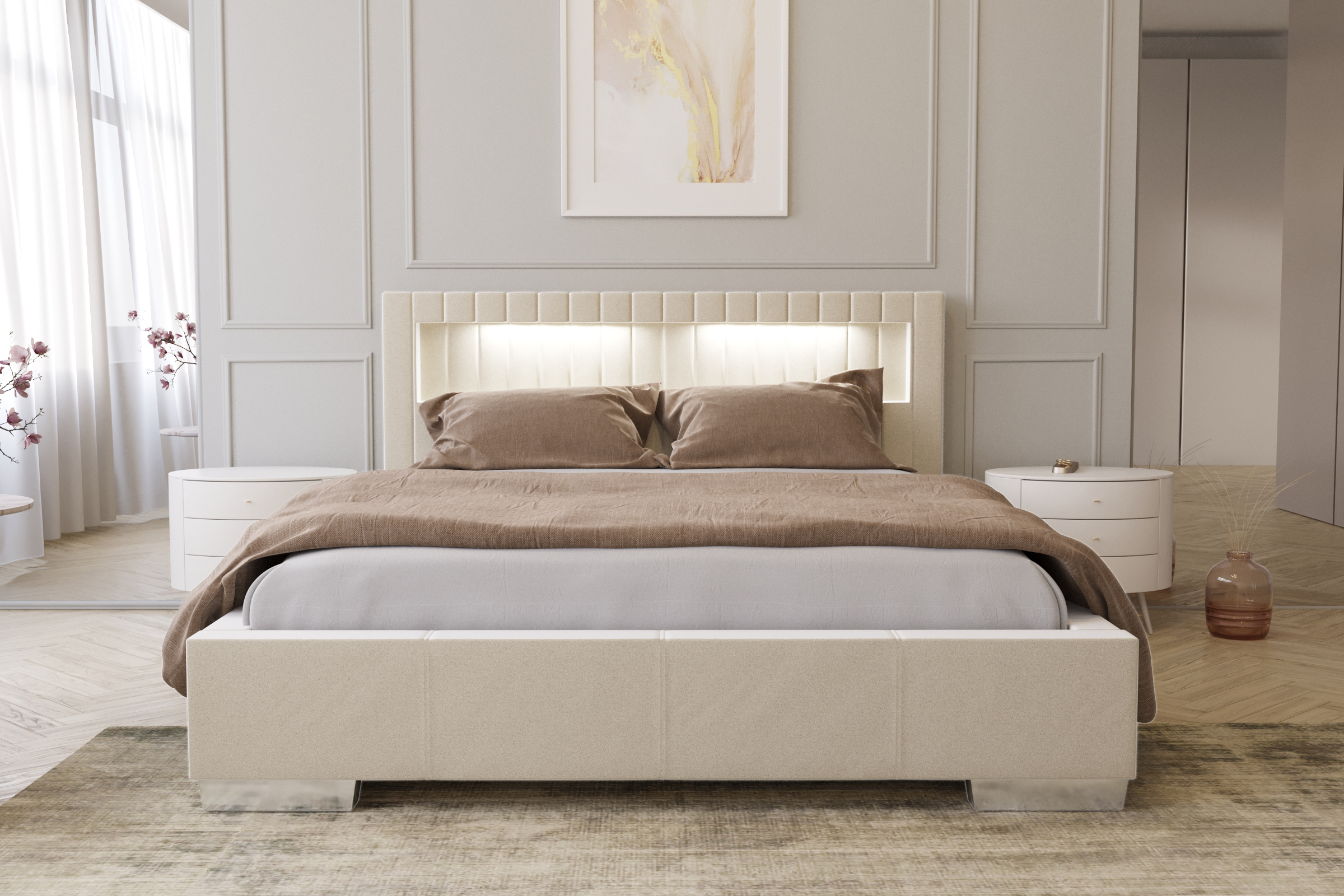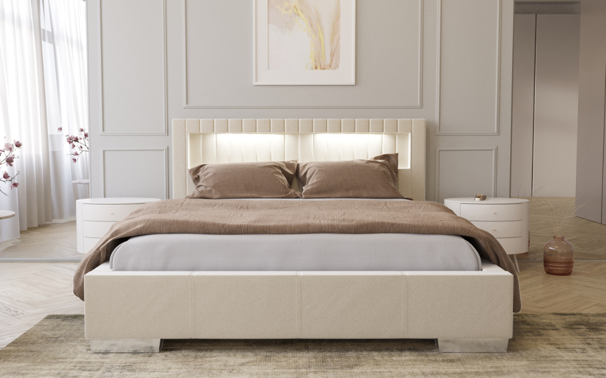 Nowoczesne, funkcjonalne łóżko tapicerowane o klasycznej konstrukcji, z prostą ramą i efektownym zagłówkiem, zdobionymi pionowymi przeszyciami. Atutem tego modelu jest praktyczny zagłówek z półką, który jest podświetlany. Łóżko doskonale sprawdzi się w każdym typie sypialni, ubogacając ją urodą prostej linii i klimatycznym światłem. Konstrukcja z płyty w obiciu z tkaniny meblowej, w szerokiej gamie kolorystycznej. Stoi stabilnie na srebrnych, plastikowych nóżkach, które za dopłatą można zamienić na drewniane w kolorze czarnym lub brązowym. Możliwość zastosowania pojemnika na pościel ze stelażem na ramie drewnianej lub metalowej. Poza standardowymi wymiarami, łóżko jest dostępne również w nietypowej długości i szerokości. Istnieje możliwość otapicerowania tyłu zagłówka za dodatkową opłatą, po ustaleniach ze specjalistami w salonach meblowych. Dla uzyskania pełnego zadowolenia klienta zalecamy odpowiedni stelaż i materac z naszej oferty. Wysokość półki 19 cm.