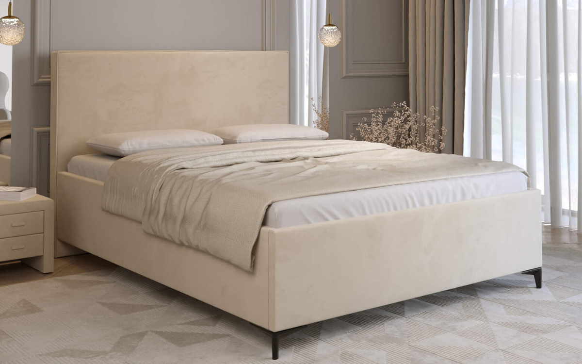 Łóżko o klasycznej konstrukcji, pasujące do każdego rodzaju wnętrza. Posiada minimalistyczny, prosty i gładki zagłówek o wysokości 118 cm i grubości około 11 cm. Łóżko dostępne w szerokiej ofercie tkanin. Wyposażone w pojemnik na pościel, który zapewnia dodatkowe miejsce do przechowywania. Stelaż na ramie metalowej, zbudowany jest z 48 listew brzozowych, giętych elastycznych. Rama otwiera się przy pomocy siłowników gazowych, co znacząco ułatwia opuszczanie i podnoszenie stelaża. Łóżko przystosowane do montażu nóżek o wysokości 12 cm.
