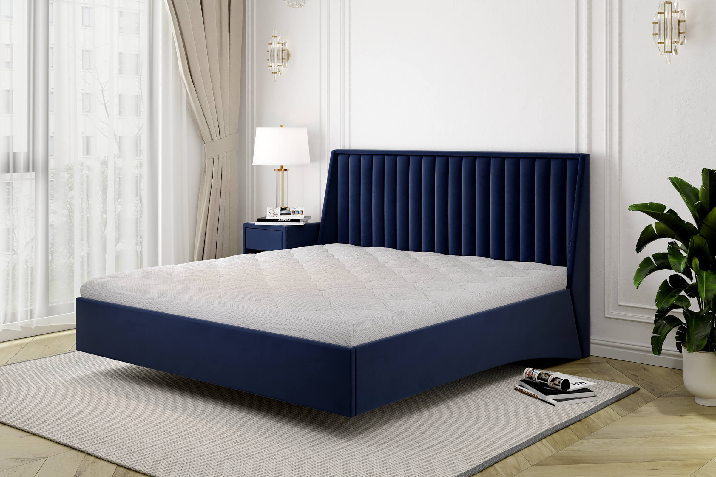 Łóżko o klasycznej konstrukcji, pasujące do każdego rodzaju wnętrza. Posiada minimalistyczny, prosty i gładki zagłówek o wysokości 118 cm i grubości około 11 cm. Łóżko dostępne w szerokiej ofercie tkanin. Wyposażone w pojemnik na pościel, który zapewnia dodatkowe miejsce do przechowywania. Stelaż na ramie metalowej, zbudowany jest z 48 listew brzozowych, giętych elastycznych. Rama otwiera się przy pomocy siłowników gazowych, co znacząco ułatwia opuszczanie i podnoszenie stelaża. Łóżko przystosowane do montażu nóżek o wysokości 12 cm.