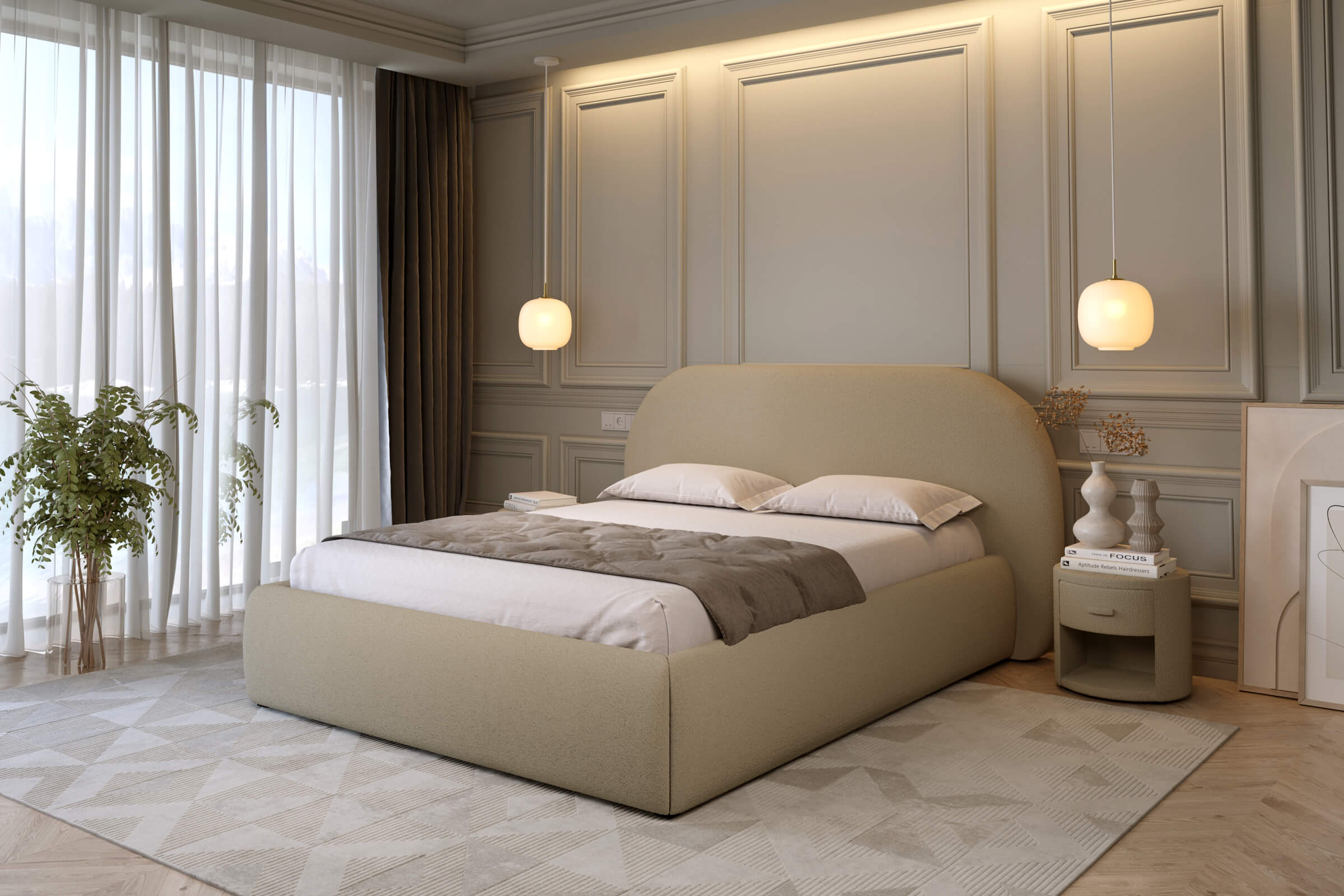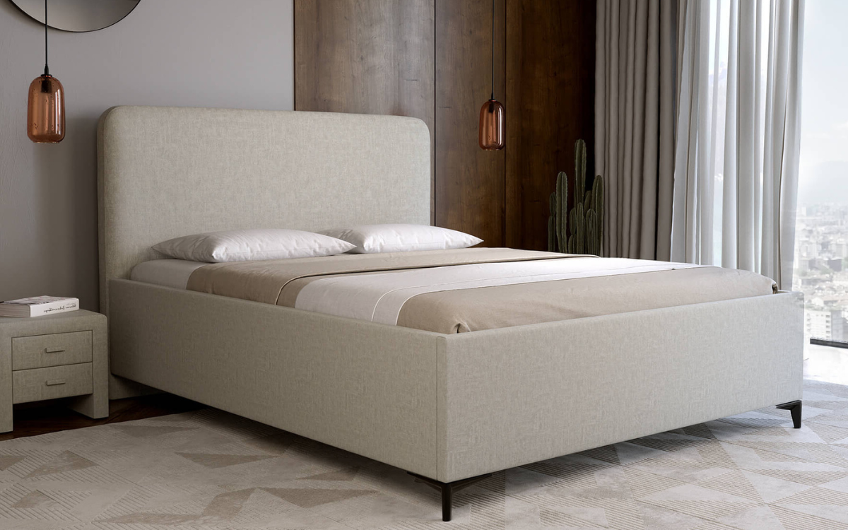Łóżko o klasycznej konstrukcji, które doskonale wpisuje się w każdy typ wnętrza. Wyposażone w minimalistyczny, prosty zagłówek z delikatnie zaokrąglonymi narożnikami. Wysokość zagłówka to około 118 cm, a jego grubość wynosi 9 cm. Model dostępny jest w szerokiej gamie tkanin obiciowych, co umożliwia dopasowanie łóżka do indywidualnej aranżacji sypialni. Łóżko wyposażono w praktyczny pojemnik na pościel, zapewniający dodatkowe miejsce do przechowywania. Stelaż oparty na metalowej ramie składa się z 48 elastycznych, giętych listew brzozowych. Dzięki siłownikom gazowym rama stelaża łatwo się podnosi i opuszcza, co podnosi komfort codziennego użytkowania. Konstrukcja łóżka przystosowana jest do montażu nóżek o wysokości 12 cm.