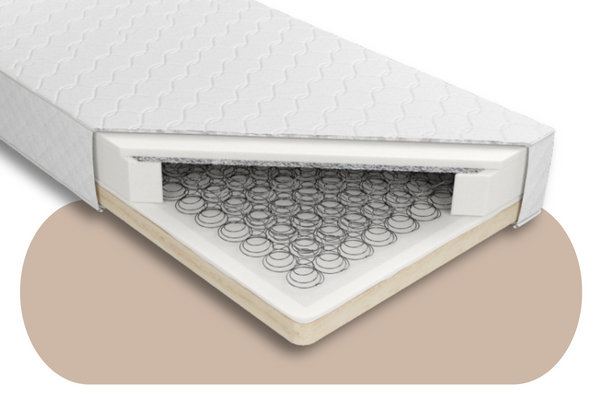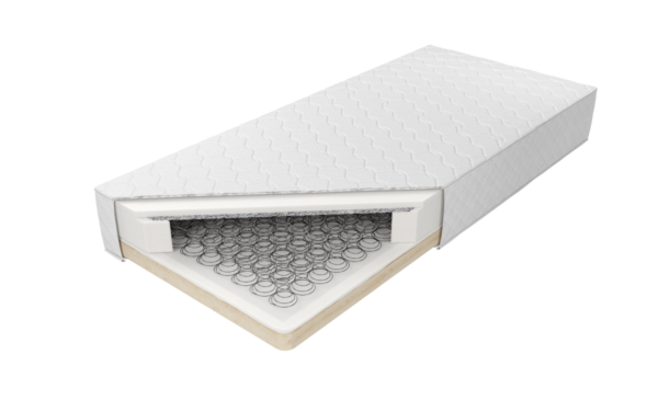 Materac na ramie drewnianej o wysokości 20 cm. Wkład materaca stanowi sprężyna bonelowa, charakteryzująca się dużą trwałością, wytrzymałością, oraz zwiększająca twardość materaca przekładka tapicerska z 2 cm warstwą elastycznej pianki poliuretanowej.