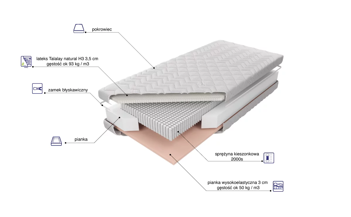 Lateks Talalay Natural H3 wyprodukowany na bazie naturalnego mleczka kauczukowego. Otwarto komórkowa struktura zwiększa poziom wentylacji i cyrkulacji powietrza. Zapewnia optymalne, stabilne podparcie kręgosłupa niezależnie od przyjętej pozycji oraz wysoki komfort snu.