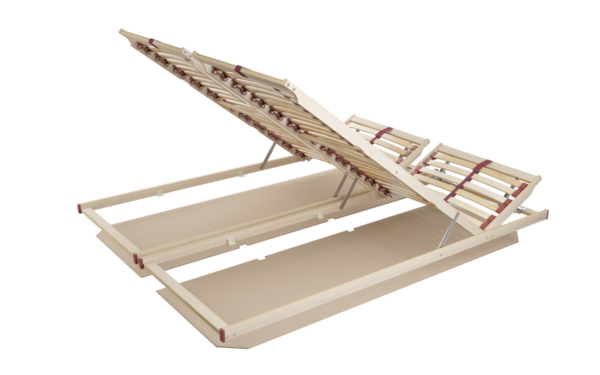 Ten stelaż do łóżka z pojemnikiem do przechowywania pościeli jest funkcjonalnym rozwiązaniem, stosowanym przy łóżkach drewnianych lub tapicerowanych, pozwalającym doskonale zagospodarować przestrzeń, jednocześnie zachowującym najważniejsze, prozdrowotne właściwości produktu. Model Duoflex DUO KF Basic tworzą dwa osobno regulowane stelaże o klejonych warstwowo bukowych listwach giętych, osadzonych w elastycznych, gumowych uchwytach na ramie stelaża, wzmocnionych pasem dla lepszego rozłożenia ciężaru. Elastyczne listwy powodują, że stelaż z materacem idealnie dopasowują się do kształtu i wagi ciała, zapewniając komfortowy, zdrowy wypoczynek. Stelaż w części środkowej ma dodatkową regulację twardości. Zalecany do wybranych łóżek tapicerowanych. Wyposażony w praktyczny, wygodny mechanizm podnoszenia. Do tego stelaża zalecane są również dwa pojedyncze materace. Sprzedawany w wersji zmontowanej. Istnieje możliwość zamówienia nietypowego rozmiaru stelaża.