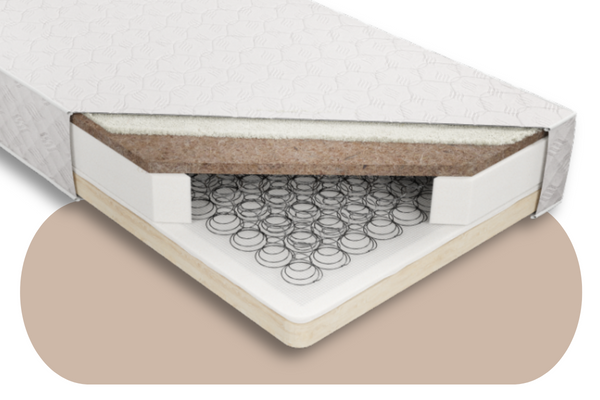 Materac na ramie drewnianej o wysokości około 21 cm. Wkład materaca stanowi sprężyna bonelowa, charakteryzująca się ogromną trwałością, oraz siatka tapicerska połączona z 3 cm warstwą sprasowanego włókna kokosowego, zwiększającego twardość, oraz stabilność powierzchni materaca. Użyta wewnątrz płyta kokosu naturalnego ogranicza rozwój i roztoczy.