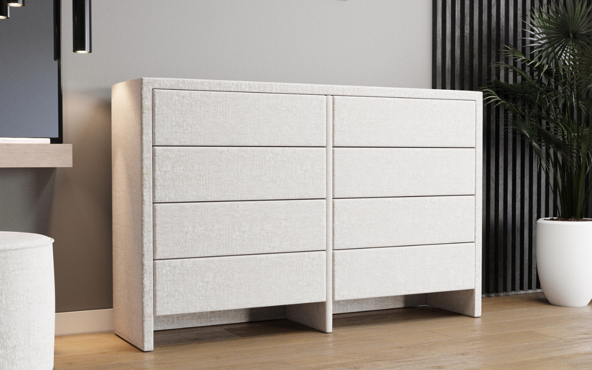 Komoda 01 tapicerowana to Twój pomocnik w organizowaniu przestrzeni i porządkach. Ta niesamowicie elegancka komoda ma aż osiem pojemnych, bezuchwytowych szuflad w dwóch rzędach. Świetnie sprawdza się jako większy mebel do przechowywania ubrań, bielizny, pościeli, ręczników czy wymiennego kompletu pościeli. Samodzielnie możesz wybrać tkaninę obiciową spośród kilkuset materiałów, wzorów i kolorów. Komoda urzeka minimalistycznym wyglądem, a jeśli cenisz nieoczywiste i ciekawe rozwiązania, koniecznie zwróć uwagę na jej nóżki, które wyglądają, jak przedłużenie panelu bocznego. Mebel posiada prowadnice Blum.