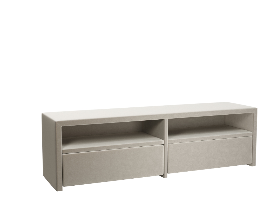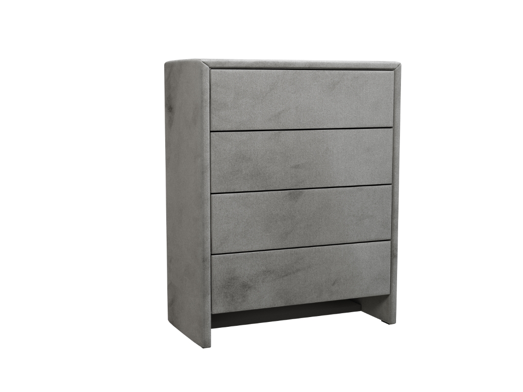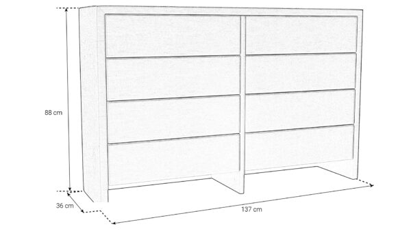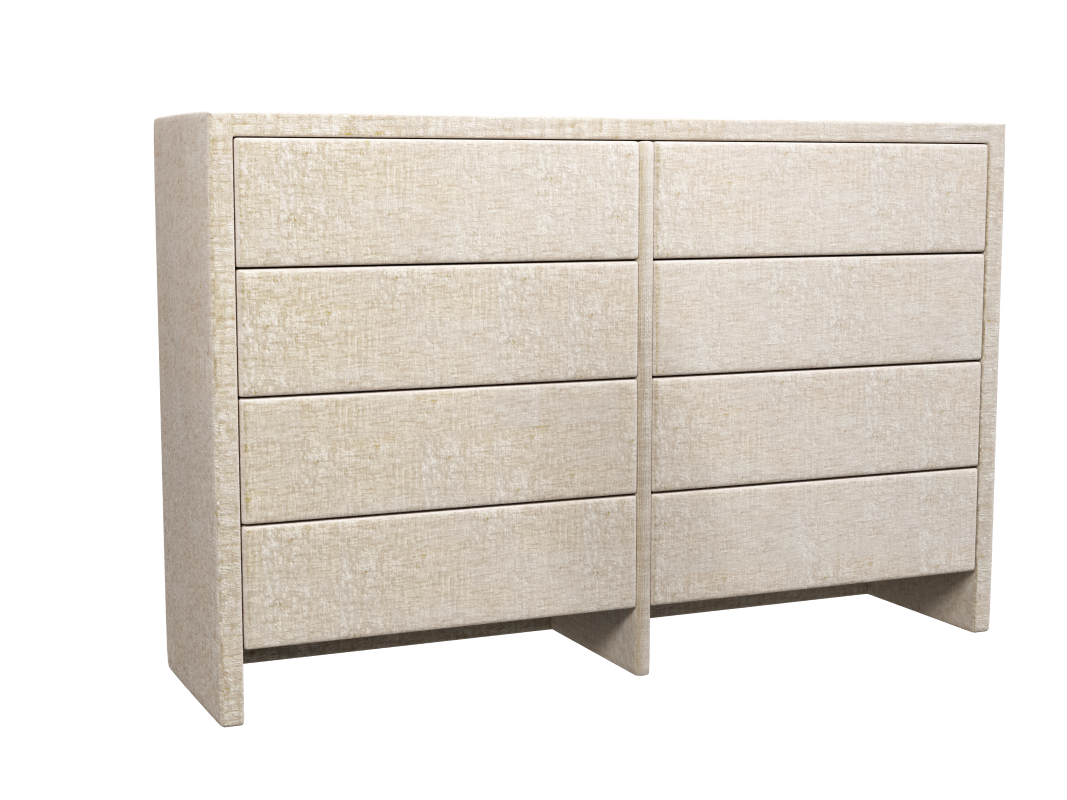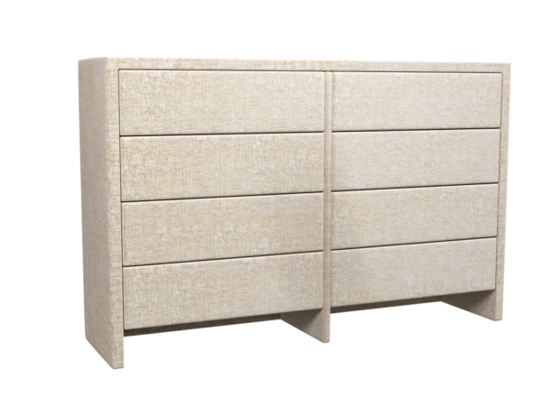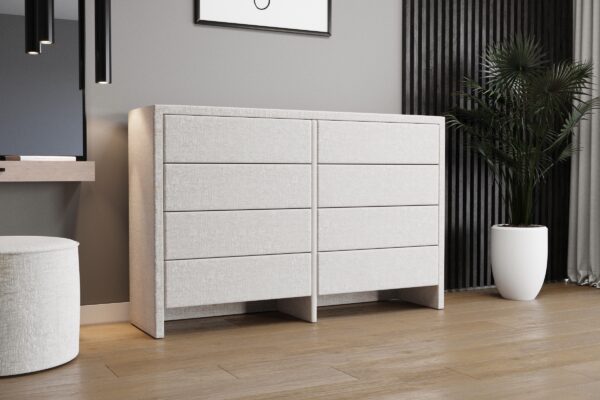 Komoda tapicerowana to twój pomocnik w organizowaniu przestrzeni i porządkach. Ta niesamowicie elegancka komoda ma aż osiem pojemnych, bezuchwytowych szuflad w dwóch rzędach. Świetnie sprawdza się jako większy mebel do przechowywania ubrań, bielizny, pościeli, ręczników czy wymiennego kompletu pościeli. Samodzielnie możesz wybrać tkaninę obiciową spośród kilkuset materiałów, wzorów i kolorów. Komoda urzeka minimalistycznym wyglądem, a jeśli cenisz nieoczywiste i ciekawe rozwiązania, koniecznie zwróć uwagę na jej nóżki, które wyglądają, jak przedłużenie panelu bocznego. Mebel posiada prowadnice Blum.
