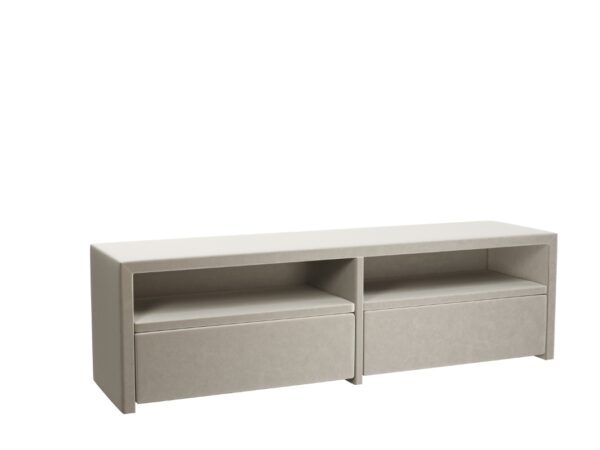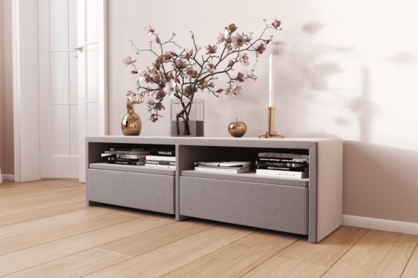 Tapicerowana komoda to nasza propozycja skierowana do klientów, którzy chcieliby urządzić nowoczesną sypialnię. Mebel zachwyca prostą linią i doskonałą symetrią kształtów, co pomoże wprowadzić spokój i harmonię do twojego życia. Komoda ma sporo przestrzeni do przechowywania. Możesz użyć rozległego blatu, dwóch osobnych półek albo dwóch zamykanych szuflad. Mebel na niewielką wysokość i dobrze sprawdzi się także jako szafka pod telewizor. Mebel posiada prowadnice Blum.