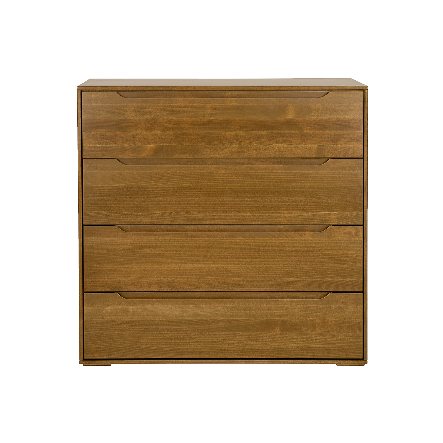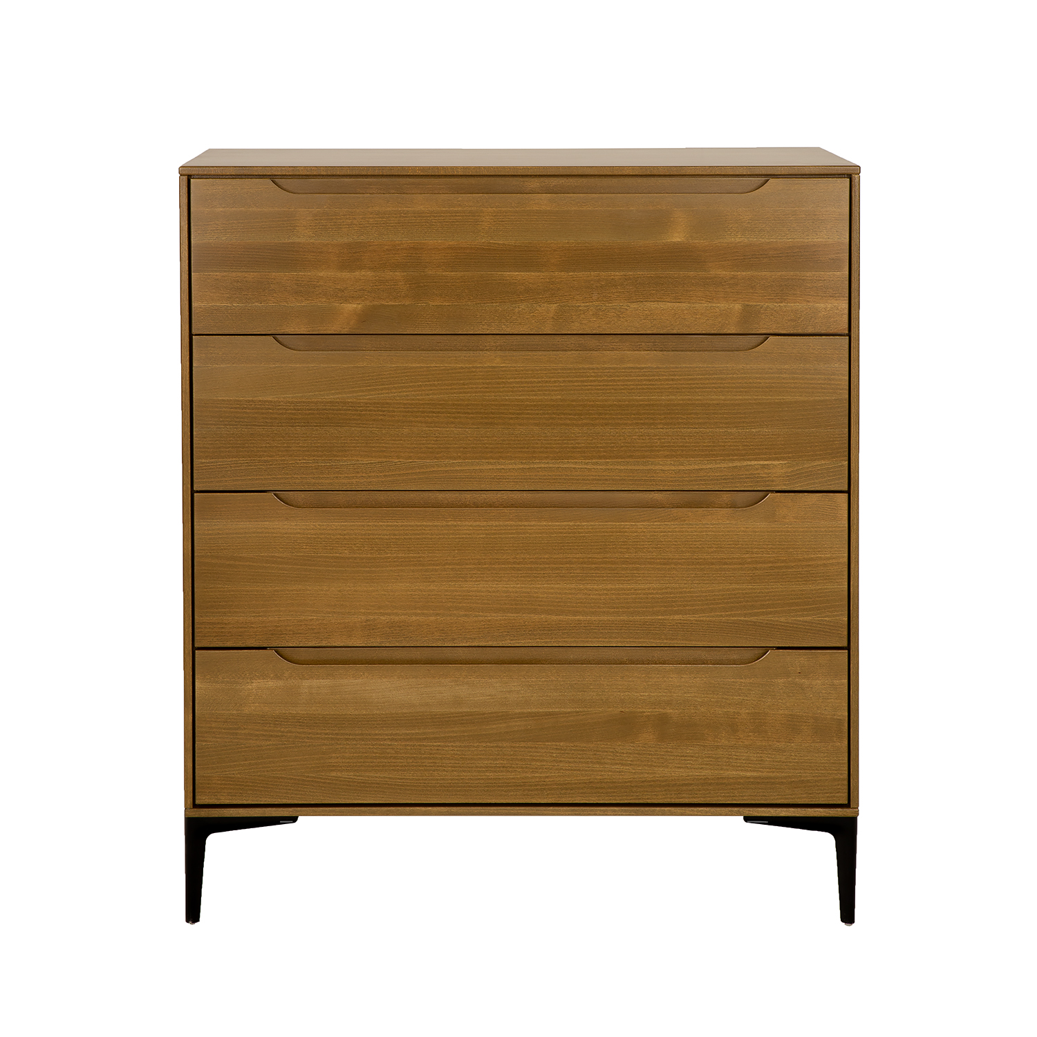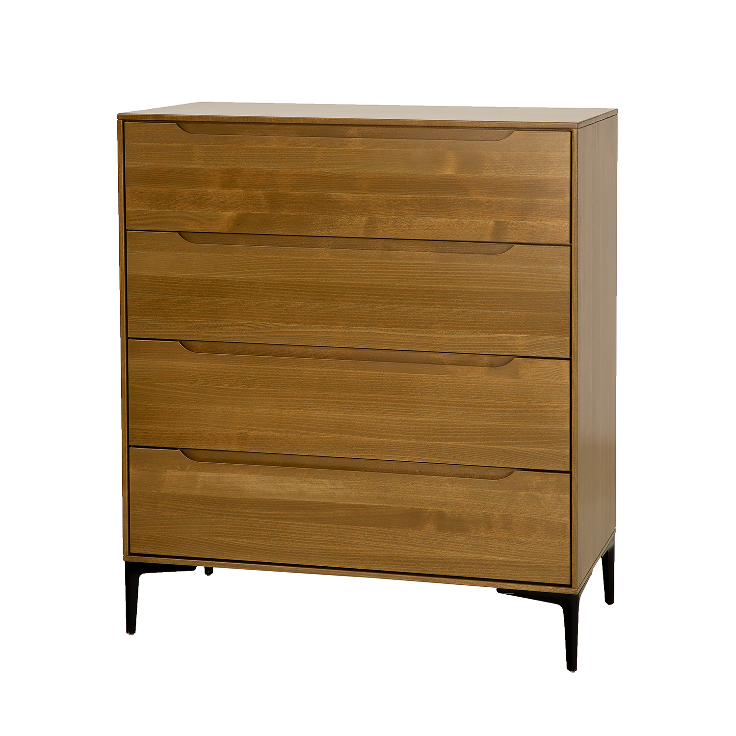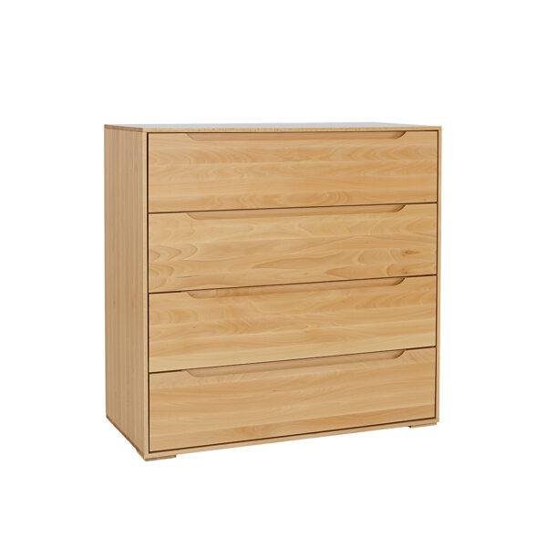 Bukowa komoda KD424 z kolekcji Modern to idealne połączenie funkcjonalności i nowoczesnego designu, które wzbogaci każdą sypialnię, salon czy jadalnię. Wykonana z najwyższej jakości litego drewna bukowego, które gwarantuje trwałość i elegancki, ponadczasowy wygląd. Wyposażona w cztery pojemne szuflady, zapewnia przestrzeń do przechowywania niezbędnych przedmiotów. Jej piękne bukowe fronty zdobią dekoracyjne podcięcia, które eliminują potrzebę uchwytów, nadając komodzie minimalistyczny i elegancki wygląd. W standardzie mebel osadzony został na niewielkich drewnianych nóżkach. Opcjonalnie istnieje możliwość wyposażenia komody w metalowe nogi, które dodają jej lekkości i unikalnego charakteru, jednocześnie ułatwiając adaptację do różnych stylów wnętrz. Komoda transportowana w całości, nie wymaga montażu.