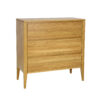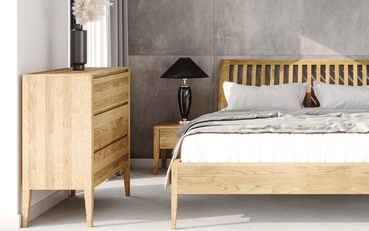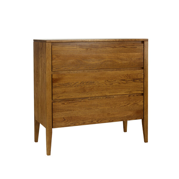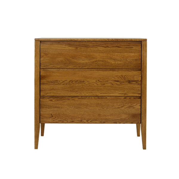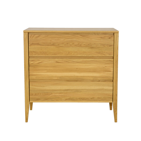 Dębowa komoda KD337 z kolekcji Retro to idealne połączenie funkcjonalności i estetyki, które wzbogaci każdą sypialnię, salon czy jadalnię. Wykonana z najwyższej jakości litego drewna dębowego, zapewnia nie tylko wytrzymałość, ale również elegancki wygląd, który pasuje do różnorodnych stylów wnętrzarskich. Wyposażona w trzy pojemne szuflady zapewniające przestrzeń do przechowywania niezbędnych przedmiotów. Ich piękne dębowe fronty zdobią subtelne, wycięte w drewnie uchwyty, tworzące nowoczesny system otwierania i zamykania. Wysokie, smukłe nogi nadają komodzie nowoczesnego wyglądu, a wnętrzu lekkości i przestronności, oferując praktyczne rozwiązania ułatwiające utrzymanie czystości. Komoda transportowana w całości, nie wymaga montażu.