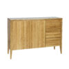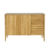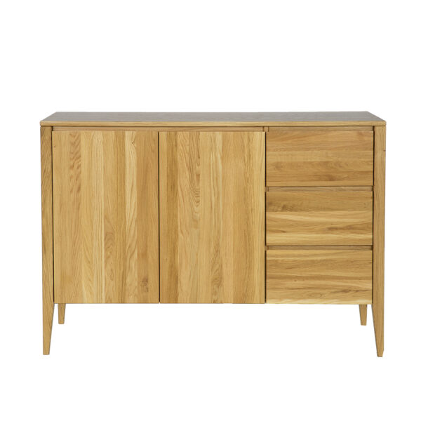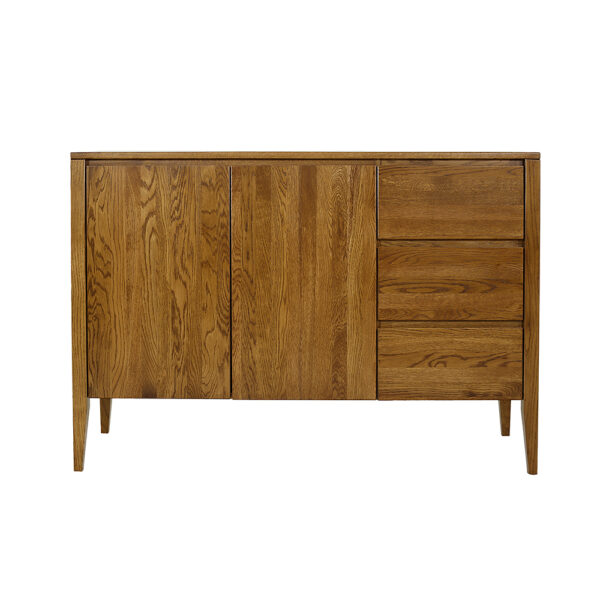 Dębowa komoda KD338 z kolekcji Retro to idealne połączenie funkcjonalności i estetyki, które wzbogaci każdą sypialnię, salon czy jadalnię. Wykonana z najwyższej jakości litego drewna dębowego, zapewnia nie tylko wytrzymałość, ale również elegancki wygląd, który pasuje do różnorodnych stylów wnętrzarskich. Wyposażona w zamykane szafki i trzy pojemne szuflady zapewniające przestrzeń do przechowywania niezbędnych przedmiotów. Ich piękne dębowe fronty zdobią subtelne, wycięte w drewnie uchwyty, tworzące nowoczesny system otwierania i zamykania. Wysokie, smukłe nogi nadają komodzie nowoczesnego wyglądu, a wnętrzu lekkości i przestronności, oferując praktyczne rozwiązania ułatwiające utrzymanie czystości. Komoda transportowana w całości, nie wymaga montażu.