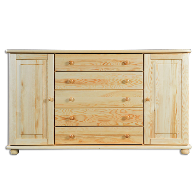 Sosnowa komoda KD120 doskonale sprawdzi się w sypialni, salonie czy przedpokoju. Dzięki swojej uniwersalności i estetyce, pasuje do różnych stylów wnętrzarskich, od skandynawskiego po rustykalny. To idealny wybór dla osób ceniących sobie funkcjonalność połączoną z naturalnym pięknem drewna. Cztery szuflady i przestronne, zamykane szafki oferują dużo miejsca do przechowywania, co sprawia, że komoda jest niezwykle praktyczna i funkcjonalna. Fronty komody zdobią ozdobne frezy, które dodają jej niepowtarzalnego uroku i klasycznego charakteru. Komoda transportowana w paczkach do montażu.