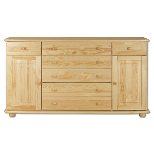 Duża sosnowa komoda KD150 to elegancki i funkcjonalny mebel, który doskonale wpasuje się w każde wnętrze. Wykonana z wysokiej jakości drewna sosnowego, charakteryzuje się trwałością i estetyką, która łączy klasyczny design z nowoczesnymi trendami. Komoda jest wyposażona w pojemne szuflady, które umożliwiają przechowywanie ubrań, bielizny czy drobiazgów codziennego użytku. Dodatkowo, komoda posiada zamykane szafki zapewniające bezpieczeństwo przechowywanych rzeczy. Fronty szafek są ozdobione wyraźnymi frezami, które dodają całemu meblowi elegancji i unikalnego charakteru. Ten detal sprawia, że komoda staje się również wyjątkowym elementem dekoracyjnym wnętrza. Komoda transportowana w całości, nie wymaga montażu.