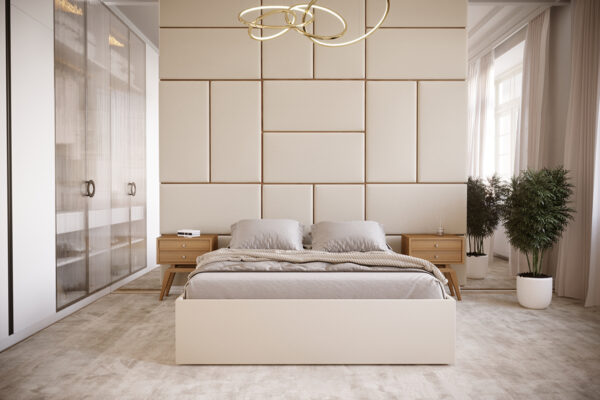Zagłówek panelowy kostka stanowi oryginalną alternatywę dla klasycznych zagłówków, gdyż pozwala nadać wezgłowiu indywidualny kształt. Składa się z elementów o wymiarach 30 x 60 cm lub 55 x 65 cm i grubości ok. 3,5 cm przeznaczonych do przyklejania na ścianę. Kostki dostępne są w bogatej ofercie tkanin obiciowych. Idealnie komponują się z korpusami z serii Multisystem. Istnieje możliwość zamówienia elementu tapicerowanego o nietypowej szerokości i długości. Ten typ paneli umożliwia nadanie sypialni niepowtarzalnego charakteru.
