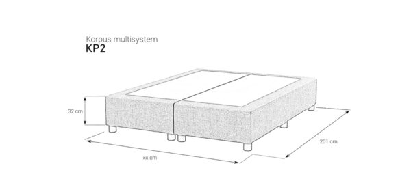 Model Korpus dwuczęściowy podstawa pod materac może stanowić samodzielne łóżko lub po zamontowaniu zagłówka stworzyć unikatowy zestaw według projektu klienta. Konstrukcję korpusu stanowią dwa niezależnie materace na ramie drewnianej z wkładem ze sprężyn bonelowych. Występuje w bogatej ofercie tkanin obiciowych. Wymaga skompletowania z wybranym rodzajem materaca M&K foam. Od szerokości wymiaru 120x200 składa się z dwóch części. Możliwość zamówienia korpusu na ślizgaczach lub pod nóżki. Za dodatkową dopłatą istnieje możliwość zamówienia korpusu o nietypowej szerokości i długości.