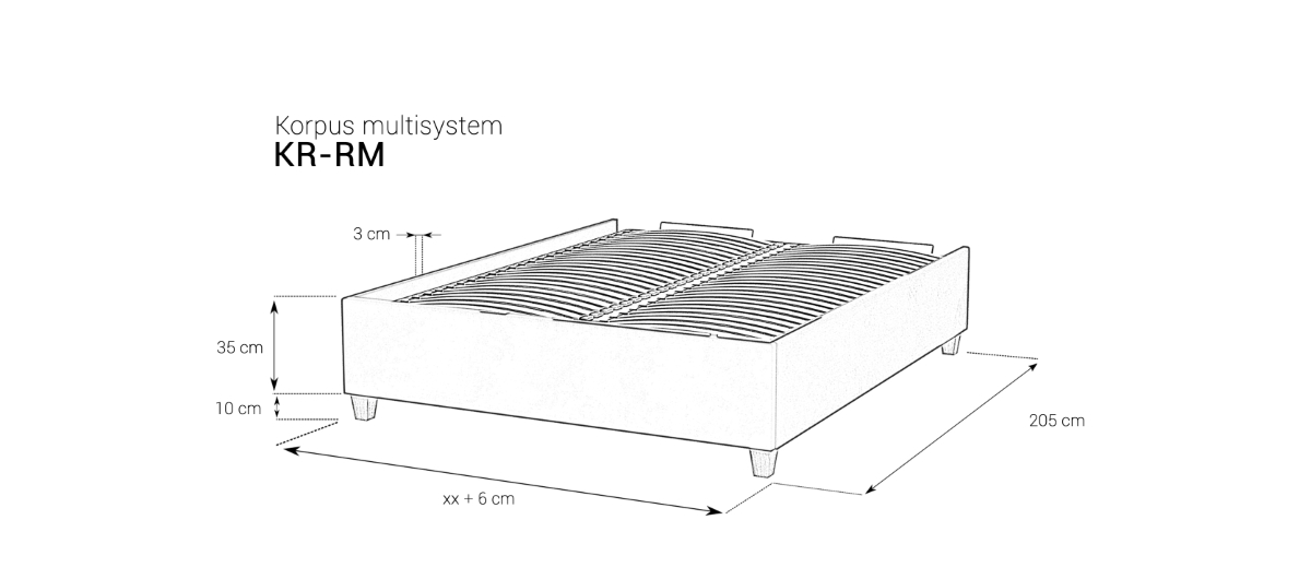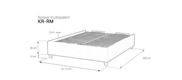 Model Korpus KR-RM ze stelażem metalowym na listwach giętych zamocowanych w elastycznych podwójnych uchwytach. Wyposażony jest w pojemnik na pościel. W korpusie są zamontowane siłowniki gazowe. Przystosowany do zamontowania zagłówka, z którym stworzy niepowtarzalne łóżko według projektu klienta. Charakteryzuje się wąskimi i wysokimi bokami. Występuje w bogatej ofercie tkanin obiciowych. Wymaga skompletowania z wybranym rodzajem materaca M&K foam. Możliwość zamówienia korpusu na ślizgaczach lub na czterech nogach drewnianych, stożkowych o wysokości 10 cm. Za dodatkową opłatą istnieje możliwość zamówienia korpusu o nietypowej szerokości i długości, jak również dołożenia regulatorów twardości w stelażu.