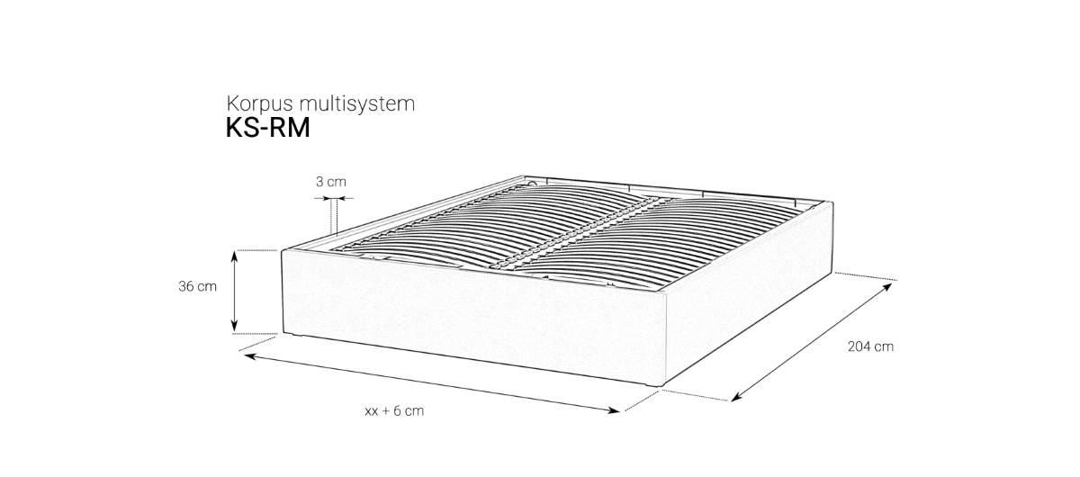 Model Korpus KS-RM ze stelażem metalowym na listwach giętych zamocowanych w elastycznych podwójnych uchwytach. Wyposażony jest w pojemnik na pościel. W korpusie są zamontowane siłowniki gazowe. Przystosowany do zamontowania zagłówka, z którym stworzy wyjątkowe łóżko według projektu klienta. Charakteryzuje się gładkimi, wąskimi i wysokimi bokami. Występuje w bogatej ofercie tkanin obiciowych. Wymaga skompletowania z wybranym rodzajem materaca M&K foam. Możliwość zamówienia korpusu na ślizgaczach lub pod nóżki. Za dodatkową opłatą istnieje możliwość zamówienia korpusu o nietypowej szerokości i długości, jak również dołożenia regulatorów twardości w stelażu.
