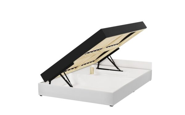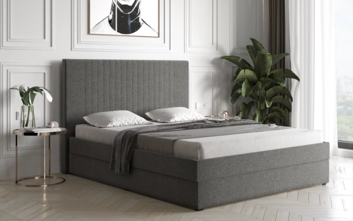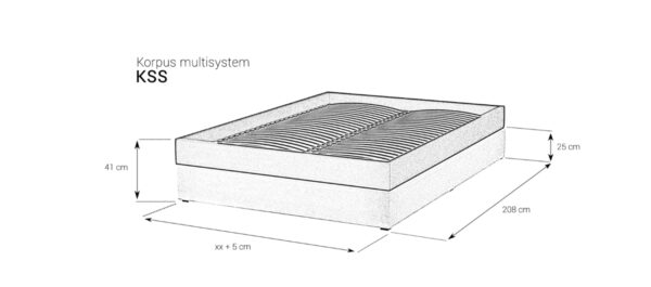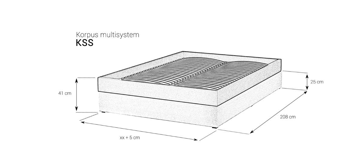 Model Korpus Skrzynia Side ze stelażem i z pojemnikiem na pościel otwieranym na bok może stanowić samodzielne łóżko lub po zamontowaniu zagłówka stworzyć wyjątkowy zestaw według projektu klienta. Występuje w bogatej ofercie tkanin obiciowych. Wymaga skompletowania z wybranym rodzajem materaca M&K foam. Korpus na ślizgaczach. Za dodatkową dopłatą istnieje możliwość zamówienia korpusu o nietypowej długości i szerokości.