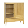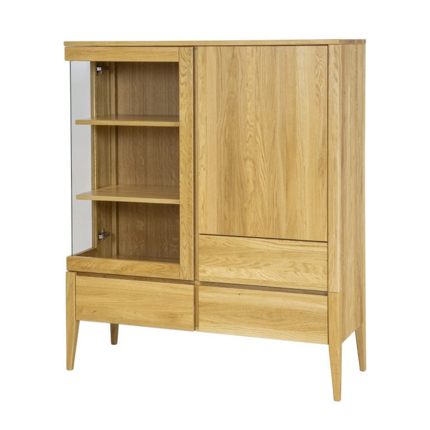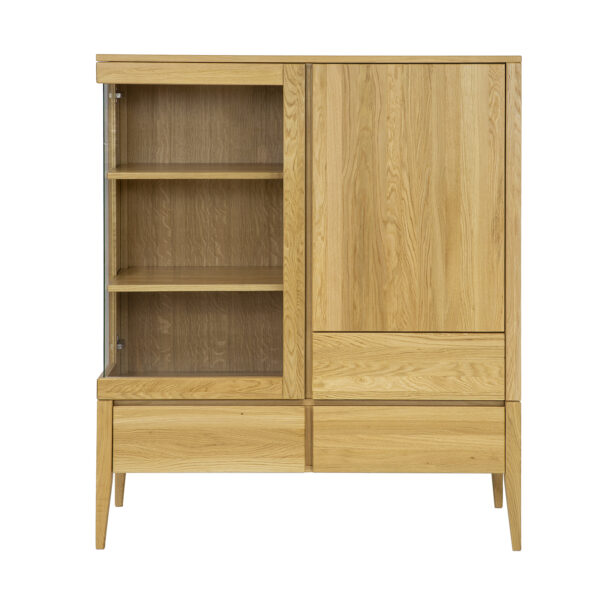 Dębowa witryna KW337 z kolekcji Retro to idealne połączenie funkcjonalności i estetyki, które wzbogaci każdy salon czy jadalnię. Wykonana z najwyższej jakości litego drewna dębowego, zapewnia nie tylko wytrzymałość, ale również elegancki wygląd, który pasuje do różnorodnych stylów wnętrzarskich. Wyposażona w trzy szuflady, zamykaną szafkę oraz przeszkloną witrynę zapewniające zarówno dużą przestrzeń do przechowywania, jak i miejsce do wyeksponowania ulubionych przedmiotów. Ich piękne dębowe fronty zdobią subtelne, wycięte w drewnie uchwyty, tworzące nowoczesny system otwierania i zamykania. Wysokie, smukłe nogi nadają witrynie nowoczesnego wyglądu, a wnętrzu lekkości i przestronności, oferując praktyczne rozwiązania ułatwiające utrzymanie czystości.