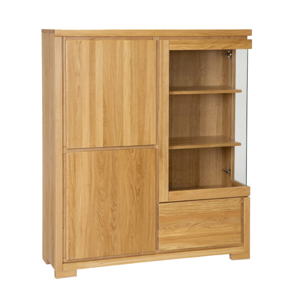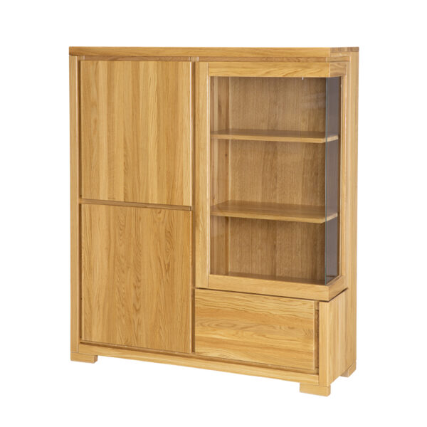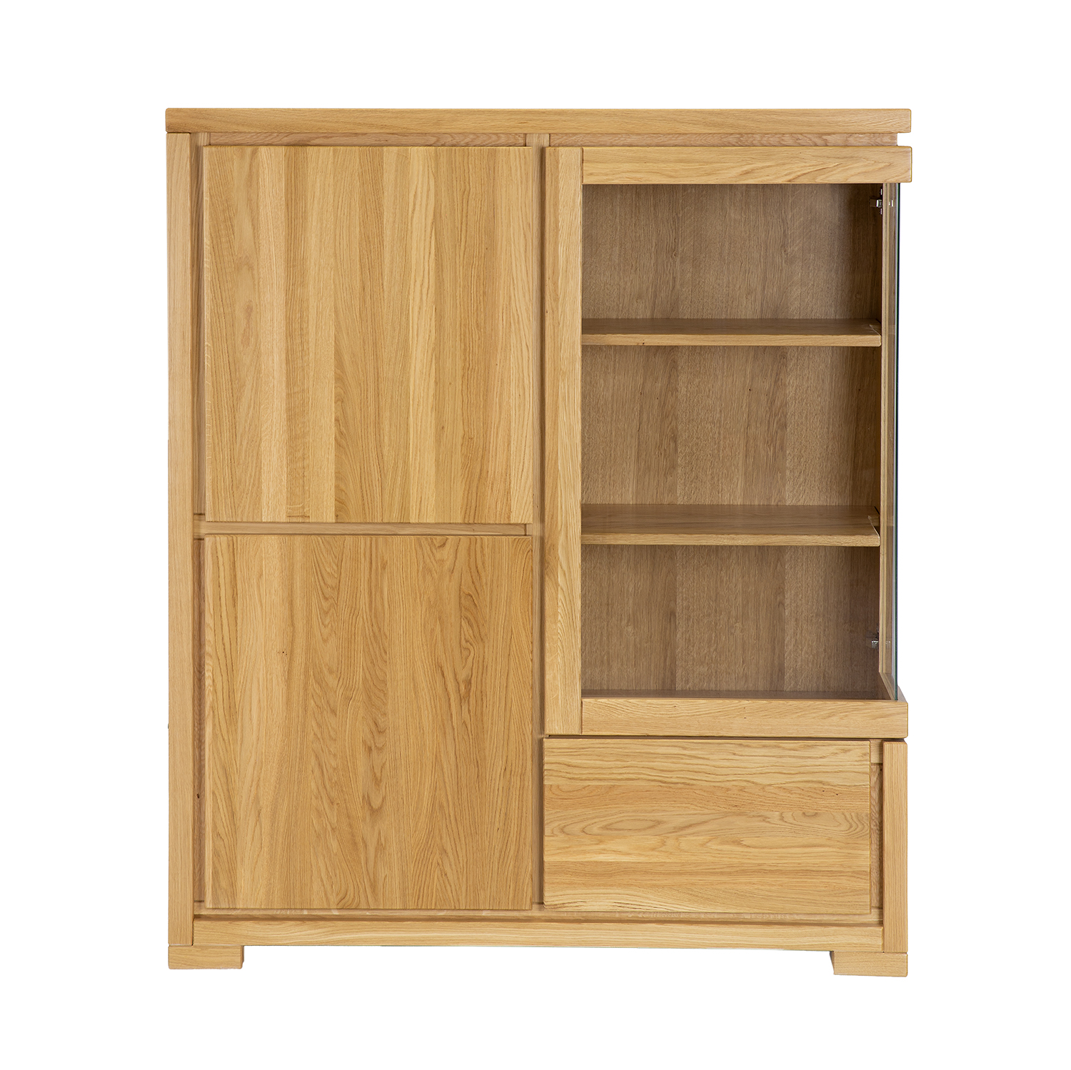Witryna KW353 z kolekcji Classic wykonana jest z drewna dębowego. Jej klasyczny wygląd bardzo dobrze wpasuje się w tradycyjną i nowoczesną aranżację wnętrza w Twoim domu. Na półkach za przeszkloną częścią możesz wyeksponować swoje pamiątki, ozdoby lub piękną zastawę obiadową. Dolna szuflada oraz półki przydadzą się do przechowywania drobnych przedmiotów i akcesoriów. Naturalny kolor mebla pozwoli Ci stworzyć w jadalni lub salonie wyjątkowy, przytulny nastrój. Witryna transportowana w całości, nie wymaga montażu.