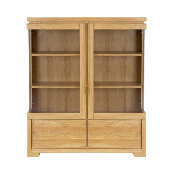 Witryna KW354 z kolekcji Classic wykonana jest z drewna dębowego. Jej klasyczny wygląd bardzo dobrze wpasuje się w tradycyjną i nowoczesną aranżację wnętrza w Twoim domu. Na półkach za przeszkloną częścią możesz wyeksponować swoje pamiątki, ozdoby lub piękną zastawę obiadową. Dolne szuflady przydadzą się do przechowywania drobnych przedmiotów i akcesoriów. Naturalny kolor mebla pozwoli Ci stworzyć w jadalni lub salonie wyjątkowy, przytulny nastrój. Witryna transportowana w całości, nie wymaga montażu.