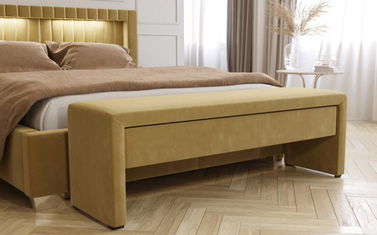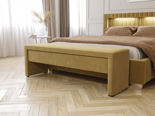 Ława jest eleganckim i praktycznym dodatkiem do każdej sypialni. Daje nieograniczone możliwości aranżacyjne. Jest wykonana z płyty i materiału obiciowego dostępnego w bogatym wzornictwie. Jej atutem jest dyskretna, funkcjonalna szuflada na prowadnicach. Stanowi idealny zestaw z łóżkami tapicerowanymi oraz multisystemem. Jej prosta, minimalistyczna forma sprawia, że doskonale prezentuje się przy każdym typie łóżka i stylu sypialni. Może stanowić samodzielny mebel. Dodaje wnętrzu uroku i finezji.