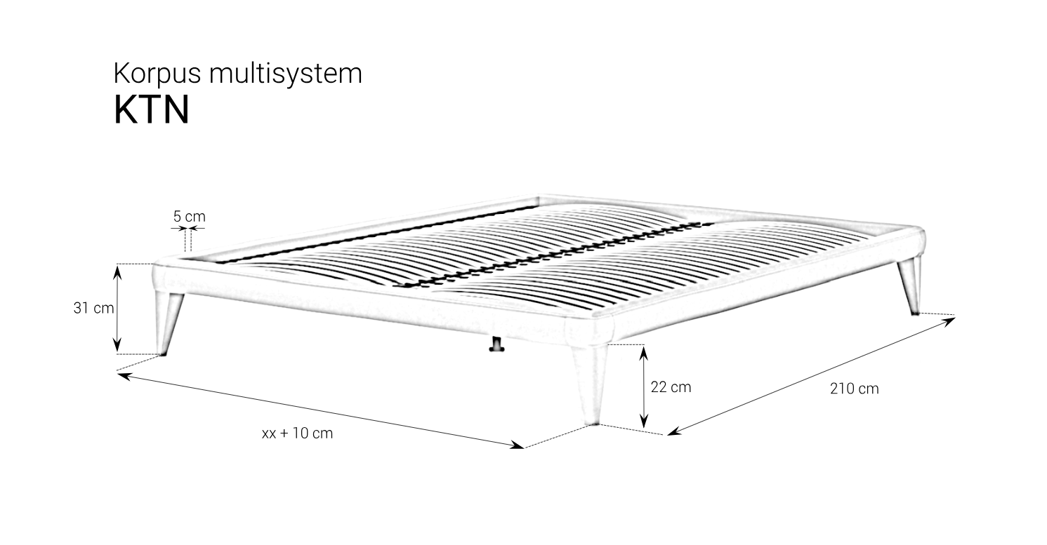 Konstrukcja łóżka opiera się na solidnym korpusie. Korpus Tapicerowany Nogi posiada wmontowane listwy gięte przymocowane na elastycznych, gumowych uchwytach. Minimalistyczna forma idealnie dopasuje się do każdej sypialni. Zaokrąglone narożniki, oraz skupiające uwagę otapicerowane nogi – to zdecydowanie element wyróżniający ten model. Występuje w bogatej ofercie tkanin obiciowych. Wymaga skompletowania z odpowiednio dobranym materacem z oferty M&K foam. Z korpusem można połączyć dowolny panel tapicerowany, lub elementy w postaci kostki, heksagonu. Za dodatkową opłatą istnieje możliwość wykonania korpusu w nietypowej długości i szerokości.