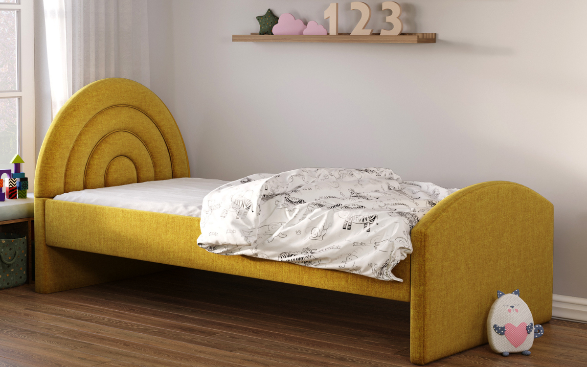 Dziecięce łóżko tapicerowane, składające się z prostej, ale solidnej ramy, uroczego zagłówka w kształcie tęczy oraz zanóżka, to nie tylko idealne miejsce do snu, ale także doskonały element dekoracyjny każdego pokoju dziecięcego. Całość wykonana z najwyższej jakości komponentów, co gwarantuje nie tylko niezrównany komfort podczas odpoczynku, ale również trwałość na długie lata. Solidna konstrukcja ramy gwarantuje stabilność i bezpieczeństwo podczas snu, co zapewnia spokojny i bezpieczny wypoczynek Twojemu dziecku. Łóżko występuje w wersjach : Wersja podstawowa wymaga dokupienia stelaża. Łóżko w wersji SP wyposażone zostało w wysuwaną szufladę - co w znacznym stopniu zwiększa funkcjonalność mebla. Wymaga dokupienia stelaża. Łóżko w wersji ST wyposażone zostało w dodatkowy, wysuwany stelaż. Maksymalna wysokość materaca do szuflady to 12cm. Materac ten jest krótszy. np łóżko 80x200 - dolny materac 80x190. Łóżko w wersji RS posiada bocznie otwierany pojemnik, który zapewnia jeszcze wyższy poziom funkcjonalności, zapewniając dodatkowe miejsce na przechowywanie najpotrzebniejszych przedmiotów. Dodatkowo, szeroki wybór tkanin pozwala dopasować łóżko do każdego rodzaju wnętrza, a przede wszystkim do charakteru jego małego właściciela lub właścicielki. Dzięki temu, możesz stworzyć niepowtarzalną atmosferę w pokoju Twojego dziecka, dodając mu przytulności i uroku. To nie tylko miejsce do spania, ale także przestrzeń do zabawy i relaksu, która będzie towarzyszyć Twojemu dziecku przez wiele lat, zachowując swoją jakość i wyjątkowy wygląd nawet przez długie lata. W wersji ST standardowo szuflada jest tapicerowana tylko z przodu. Istnieje możliwość tapicerowania także jej tylnej części za dodatkową opłatą.