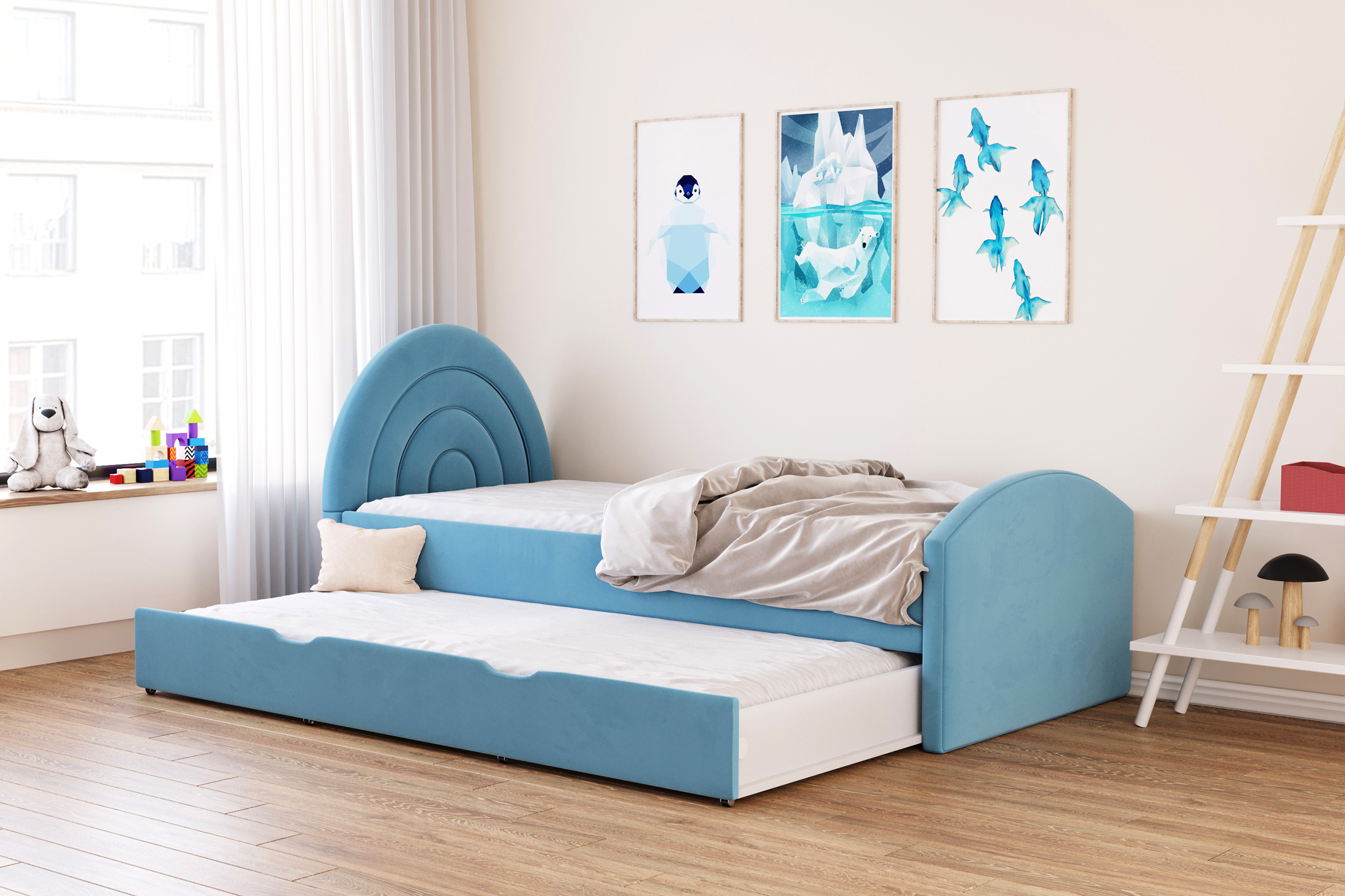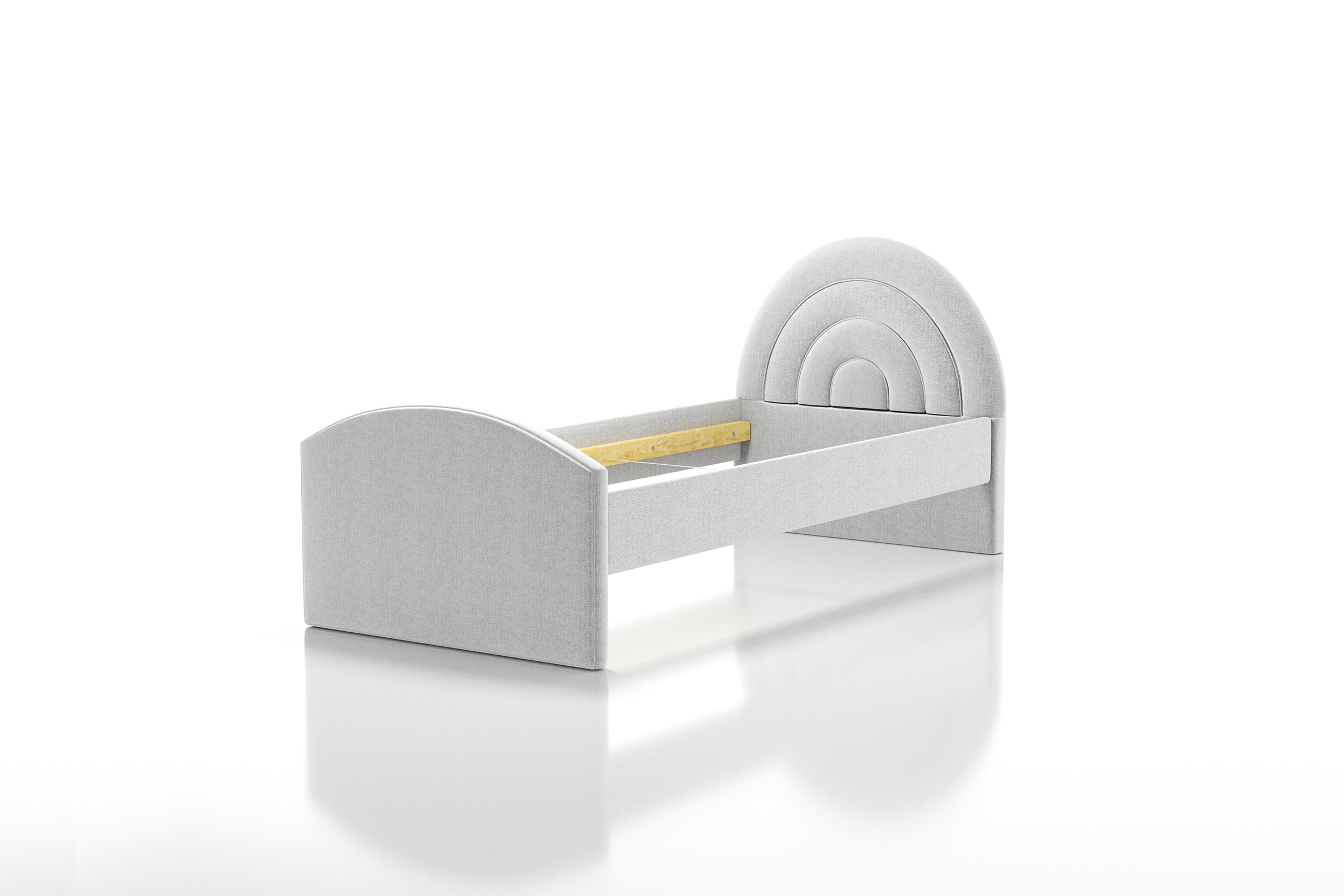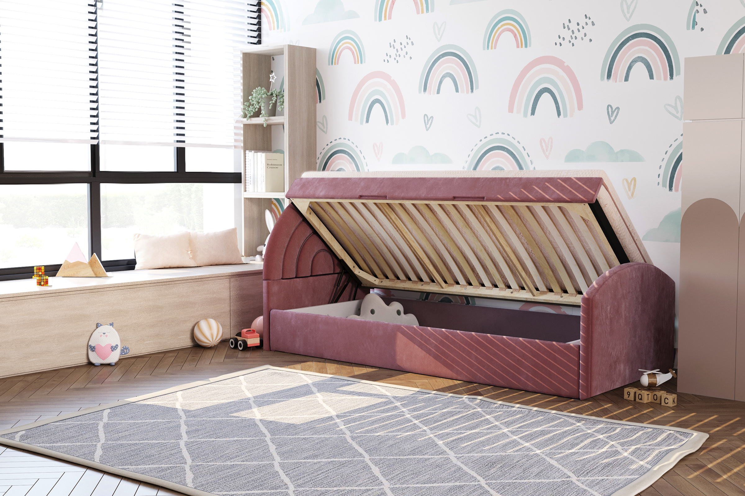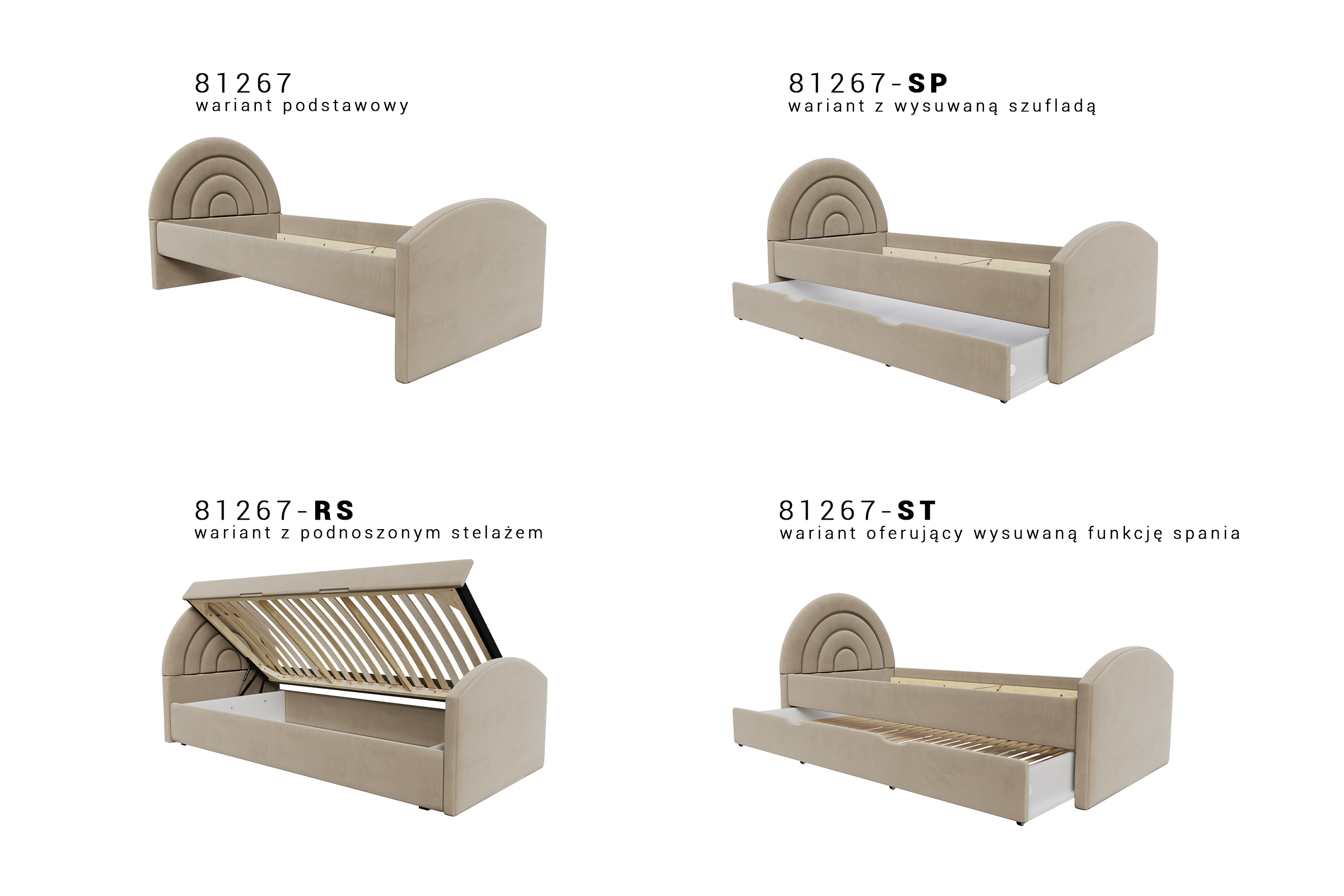 Dziecięce łóżko tapicerowane, składające się z prostej, ale solidnej ramy, uroczego zagłówka w kształcie tęczy oraz zanóżka, to nie tylko idealne miejsce do snu, ale także doskonały element dekoracyjny każdego pokoju dziecięcego. Całość wykonana z najwyższej jakości komponentów, co gwarantuje nie tylko niezrównany komfort podczas odpoczynku, ale również trwałość na długie lata. Solidna konstrukcja ramy gwarantuje stabilność i bezpieczeństwo podczas snu, co zapewnia spokojny i bezpieczny wypoczynek Twojemu dziecku. Łóżko występuje w wersjach : Wersja podstawowa wymaga dokupienia stelaża. Łóżko w wersji SP wyposażone zostało w wysuwaną szufladę - co w znacznym stopniu zwiększa funkcjonalność mebla. Wymaga dokupienia stelaża. Łóżko w wersji ST wyposażone zostało w dodatkowy, wysuwany stelaż. Maksymalna wysokość materaca do szuflady to 12cm. Materac ten jest krótszy. np łóżko 80x200 - dolny materac 80x190. Łóżko w wersji RS posiada bocznie otwierany pojemnik, który zapewnia jeszcze wyższy poziom funkcjonalności, zapewniając dodatkowe miejsce na przechowywanie najpotrzebniejszych przedmiotów. Dodatkowo, szeroki wybór tkanin pozwala dopasować łóżko do każdego rodzaju wnętrza, a przede wszystkim do charakteru jego małego właściciela lub właścicielki. Dzięki temu, możesz stworzyć niepowtarzalną atmosferę w pokoju Twojego dziecka, dodając mu przytulności i uroku. To nie tylko miejsce do spania, ale także przestrzeń do zabawy i relaksu, która będzie towarzyszyć Twojemu dziecku przez wiele lat, zachowując swoją jakość i wyjątkowy wygląd nawet przez długie lata. W wersji ST standardowo szuflada jest tapicerowana tylko z przodu. Istnieje możliwość tapicerowania także jej tylnej części za dodatkową opłatą.