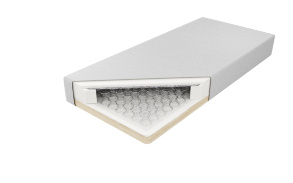 Jednostronny materac o wysokości ok. 22 cm posiada wbudowany stelaż mający kluczowe znaczenie w konstrukcji łóżka, odpowiadający za prawidłowe wsparcie i wentylację. Dostępny jest w dwóch wersjach do wyboru: bez nóżek - w roli wypełnienia łóżka - lub w wersji pod nóżki, czyli w randze kompletnego łóżka. W tym modelu zastosowana została sprężyna bonelowa, charakteryzująca się dużą trwałością, wytrzymałością i sprężystością, sprzyjająca cyrkulacji powietrza. Z jednej strony użyta została wzmacniająca konstrukcję i zwiększająca wentylację siatka tapicerska wraz z 1 cm warstwą elastycznej pianki trudnozapalnej CMHR 30100, swobodnie dopasowującej się do ciała, wytrzymałej, antyalergicznej. Z drugiej strony wydłużająca wytrzymałość i zwiększająca twardość podłoża przekładka tapicerska połączona została z 25-mm warstwą pianki trudnozapalnej CMHR 30100, której elementy składowe zapobiegają rozprzestrzenianiu się ognia, minimalizując ryzyko powstania pożaru, co zostało potwierdzone atestem CRIB 5. Pokrowiec niepikowany wykonany jest z materiału trudnozapalnego o składzie 100 % bawełny. Materiał spełnia wymogi normy trudnozapalności CRIB 5. Ze względu na swoje właściwości w zakresie trudnozapalności materace z tym pokrowcem rekomendowane są do hoteli, pensjonatów i innych tego typu obiektów.