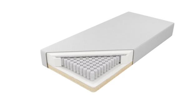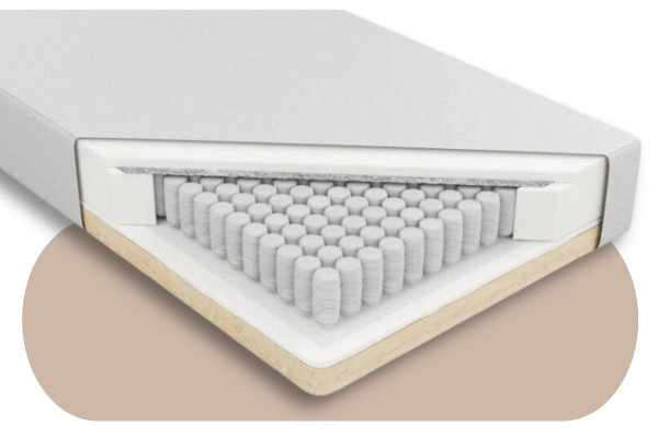 Jednostronny materac o wysokości ok. 23 cm posiada wbudowany stelaż mający kluczowe znaczenie w konstrukcji łóżka i odpowiadający za prawidłowe wsparcie i wentylację. Dostępny jest w dwóch wersjach do wyboru: bez nóżek - w roli wypełnienia łóżka - lub w wersji pod nóżki (z optymalną ich liczbą dla wybranego rozmiaru szerokości), czyli w randze kompletnego łóżka. Rdzeń materaca stanowią umieszczone w pojedynczych kieszonkach elastyczne sprężyny z wysokogatunkowego drutu (ok. 255 sztuk w 1 m. kw. materaca), zapewniające doskonałe podparcie punktowe ciała. Z jednej strony użyta została wzmacniająca konstrukcję i zwiększająca wentylację siatka tapicerska wraz z 1 cm warstwą elastycznej pianki trudnozapalnej CMHR 30100, swobodnie dopasowującej się do ciała, wytrzymałej, antyalergicznej. Z drugiej strony wydłużająca wytrzymałość i zwiększająca twardość podłoża przekładka tapicerska połączona została z 2,5 cm warstwą pianki trudnozapalnej CMHR 30100. Materac wyposażony jest w trudnozapalny pokrowiec wykonany jest z materiału trudnozapalnego o składzie 100 % bawełny- zastosowane do jego stworzenia komponenty i technologie zapobiegają rozprzestrzenianiu się otwartego ognia i minimalizują ryzyko powstania pożaru, co potwierdzone zostało atestem CRIB 5.