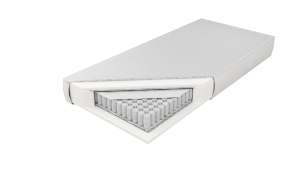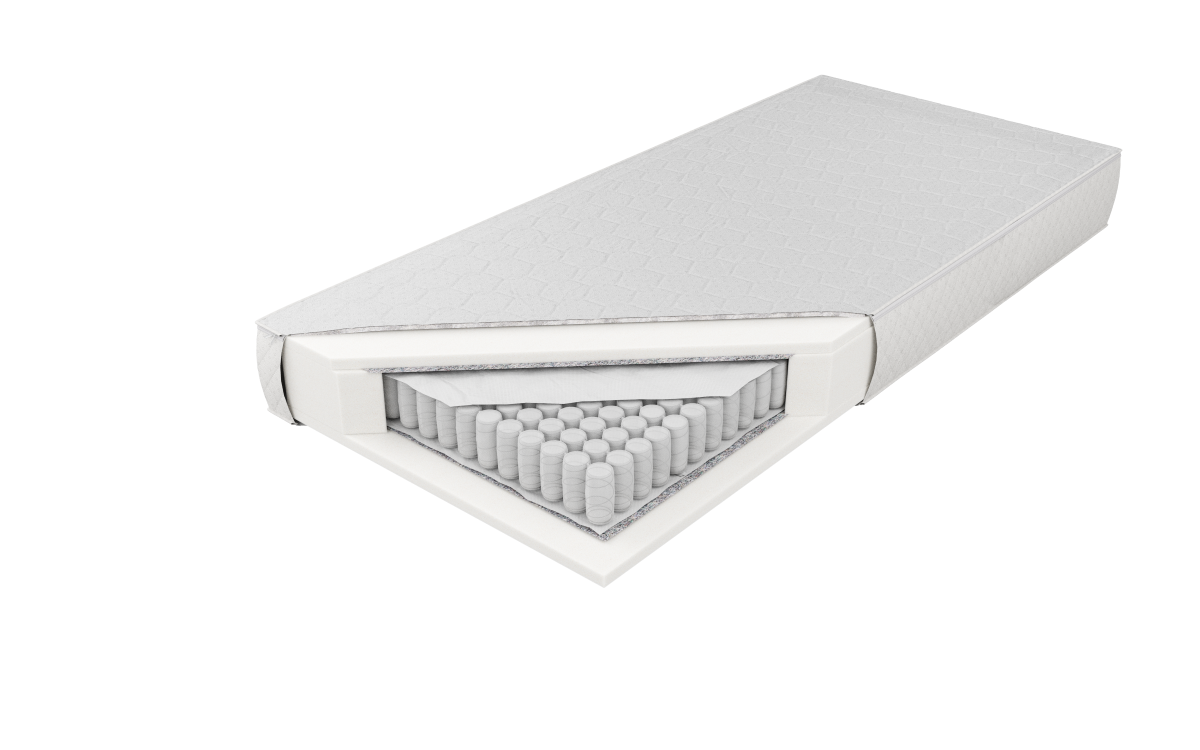 Materac o wysokości ok. 19 cm w zależności od pokrowca, zbudowany ze sprężyn kieszeniowych z wysokogatunkowego drutu (ok. 255 sztuk w 1 m. kw.), zapewniających doskonałe podparcie punktowe ciała. Obustronnie zastosowana została wydłużająca wytrzymałość i zwiększająca twardość podłoża przekładka tapicerska oraz 2,5 cm warstwa pianki trudnozapalnej CMHR 30100. Pokrowiec wykonany jest z materiału trudnozapalnego o składzie 100 % bawełny. Materiał spełnia wymogi normy trudnozapalności CRIB 5.