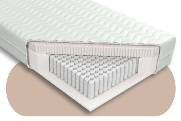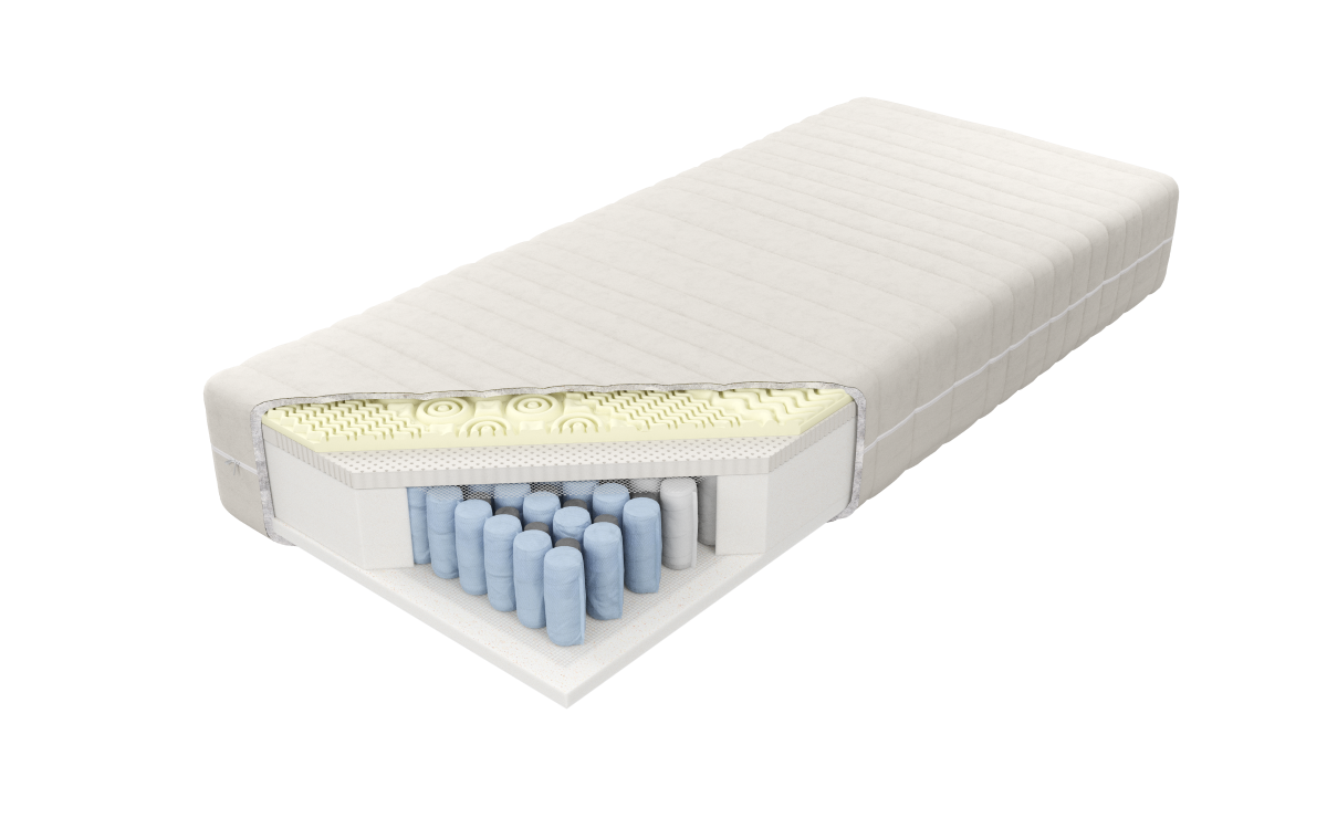 Materac o wysokości ok. 24 cm amortyzuje ok. 482 bezgłośnych sprężyn w każdym metrze kwadratowym powierzchni, zbudowanych z wysokogatunkowego drutu, umieszczonych w pojedynczych kieszonkach. Takie rozwiązanie poprawia elastyczność i zwiększa punktowe podparcie ciała. Z jednej strony zastosowana została 7 cm warstwa produkowanego na bazie naturalnego mleczka kauczukowego lateksu Talalay Natural. Jego otwartokomórkowa struktura przyczynia się do doskonałej wentylacji i cyrkulacji powietrza. Zapewnia komfort i optymalne podparcie głowy, szyi i ramion. Drugą stronę stanowi 2 cm warstwa wytrzymałej, nie odkształcającej się, elastycznej pianki poliuretanowej. Materac rekomendowany jest dla osób o wadze do 80 kg. Obustronnie zastosowania siatka tapicerska wzmacnia konstrukcję materaca i zwiększa jego wentylację. Utrzymaniu higieny służy zamek błyskawiczny, umożliwiający zdjęcie i wypranie pokrowca. Produkt jest zgodny z wytycznymi Cradle to Cradle Certified ™. Jakość użytych tekstyliów mających kontakt ze skórą potwierdza Certyfikat Oeco-Tex. Niektóre pokrowce pikowane są 200g / m2, upewnij się u sprzedawcy przed zakupem, jaką gramaturę ma wybrany pokrowiec.