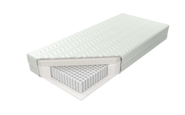 Materac o wysokości ok. 24 cm amortyzuje ok. 482 bezgłośnych sprężyn w każdym metrze kwadratowym powierzchni, zbudowanych z wysokogatunkowego drutu, umieszczonych w pojedynczych kieszonkach. Takie rozwiązanie poprawia elastyczność i zwiększa punktowe podparcie ciała. Z jednej strony zastosowana została 7 cm warstwa produkowanego na bazie naturalnego mleczka kauczukowego lateksu Talalay Natural. Jego otwartokomórkowa struktura przyczynia się do doskonałej wentylacji i cyrkulacji powietrza. Zapewnia komfort i optymalne podparcie głowy, szyi i ramion. Drugą stronę stanowi 2 cm warstwa wytrzymałej, nie odkształcającej się, elastycznej pianki poliuretanowej. Materac rekomendowany jest dla osób o dużej wadze. Obustronnie zastosowania siatka tapicerska wzmacnia konstrukcję materaca i zwiększa jego wentylację. Utrzymaniu higieny służy zamek błyskawiczny, umożliwiający zdjęcie i wypranie pokrowca. Produkt jest zgodny z wytycznymi Cradle to Cradle Certified ™. Jakość użytych tekstyliów mających kontakt ze skórą potwierdza Certyfikat Oeco-Tex. Niektóre pokrowce pikowane są 200g / m2, upewnij się u sprzedawcy przed zakupem, jaką gramaturę ma wybrany pokrowiec.