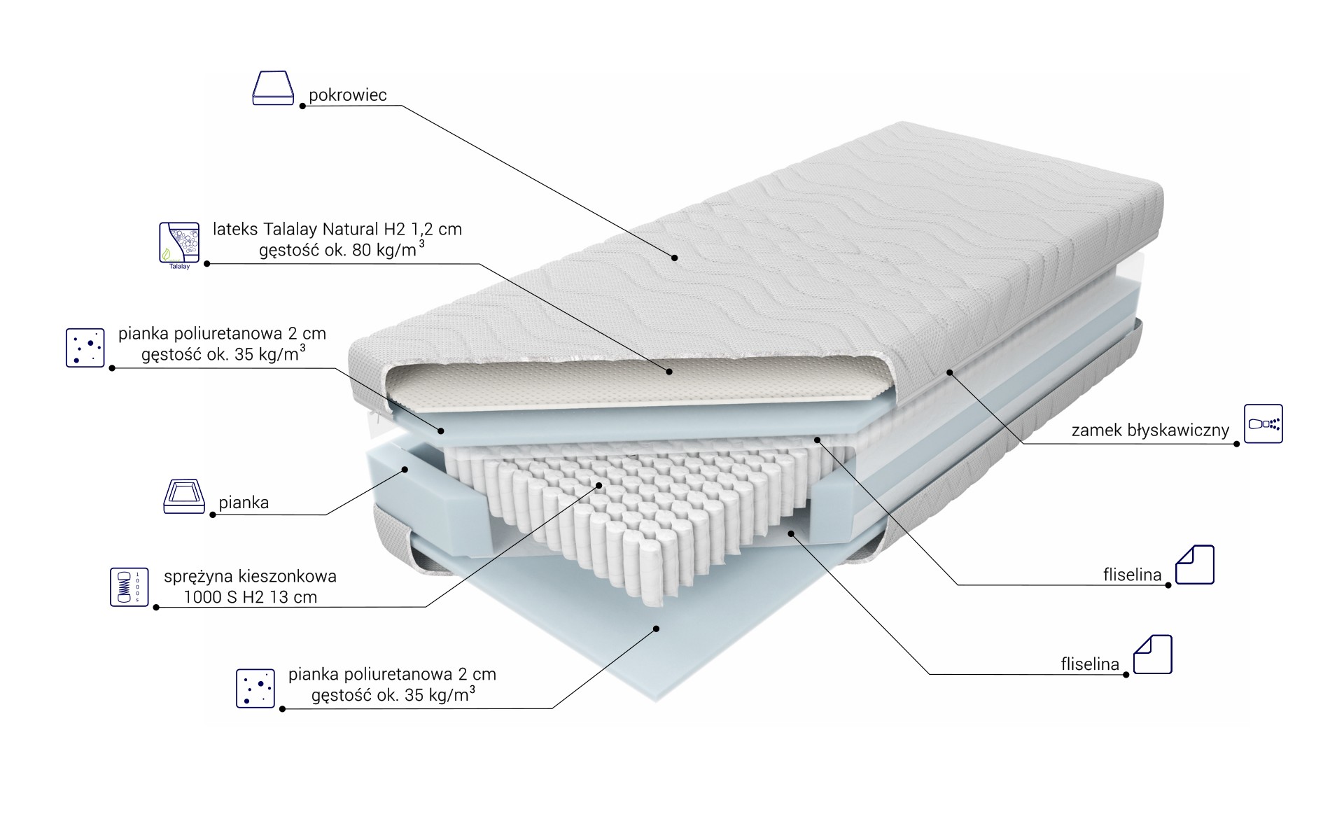 Wkład materaca o wysokości ok. 18,2 cm zbudowany jest ze sprężyn 1000S z wysokogatunkowego drutu, umieszczonych w pojedynczych kieszonkach o średnicy 39 mm. Z jednej strony materaca znajduje się 1,2 cm warstwa naturalnego lateksu Talalay, połączona z 2 cm warstwą pianki poliuretanowej. Lateks Talalay produkowany jest na bazie naturalnego mleczka kauczukowego, o otwartokomórkowej strukturze sprzyjającej doskonałej wentylacji i cyrkulacji powietrza. Zapewnia optymalne podparcie, wpływające na komfort wypoczynku. Z drugiej strony użyta została 2 cm warstwa wytrzymałej, nieodkształcającej się pianki poliuretanowej. Wykorzystanie zamka błyskawicznego, który umożliwia zdjęcie i wypranie pokrowca, znacząco ułatwia utrzymanie go w czystości.