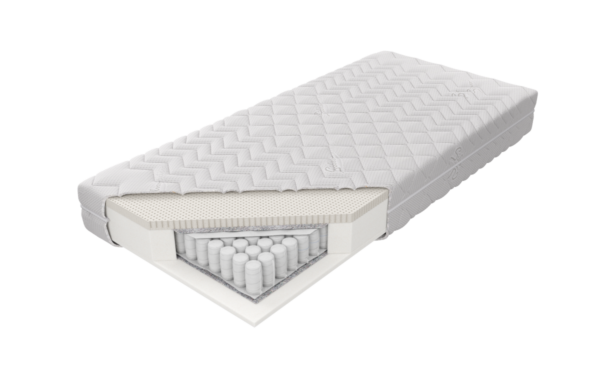 Materac o wysokości ok. 19 cm amortyzuje ok. 264 bezgłośnych sprężyn na każdym metrze kwadratowym powierzchni, zbudowanych z wysokogatunkowego drutu, umieszczonych w pojedynczych kieszonkach. Takie rozwiązanie poprawia elastyczność i zwiększa punktowe podparcie ciała. Istnieje możliwość wyboru sprężyn 1-dno lub siedmio-polowych. Materac siedmiopolowy posiada siedem stref twardości utrzymujących poszczególne części ciała (głowę, kręgosłup piersiowy, lędźwie, miednicę, uda, łydki, stopy) w położeniu dopasowanym do budowy anatomicznej. Z jednej strony zastosowana została 3,5 cm warstwa produkowanego na bazie naturalnego mleczka kauczukowego lateksu Talalay Natural. Jego otwartokomórkowa struktura przyczynia się do doskonałej wentylacji i cyrkulacji powietrza. Zapewnia komfort i optymalne podparcie głowy, szyi i ramion. Drugą stronę stanowi 2 cm warstwa wytrzymałej, nie odkształcającej się, elastycznej pianki poliuretanowej. Zastosowania z każdej strony przekładka tapicerska doskonale izoluje, zwiększa twardość i wydłuża żywotność produktu. Materac rekomendowany jest dla osób o dużej wadze. Utrzymaniu higieny służy zamek błyskawiczny, umożliwiający zdjęcie i wypranie pokrowca. Produkt jest zgodny z wytycznymi Cradle to Cradle Certified ™. Jakość użytych tekstyliów mających kontakt ze skórą potwierdza Certyfikat Oeco-Tex. Niektóre pokrowce pikowane są 200g / m2, upewnij się u sprzedawcy przed zakupem, jaką gramaturę ma wybrany pokrowiec.