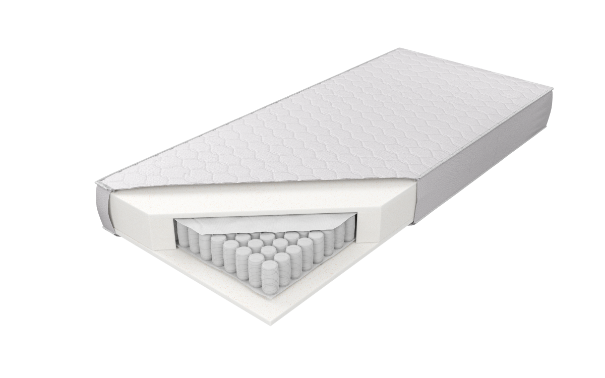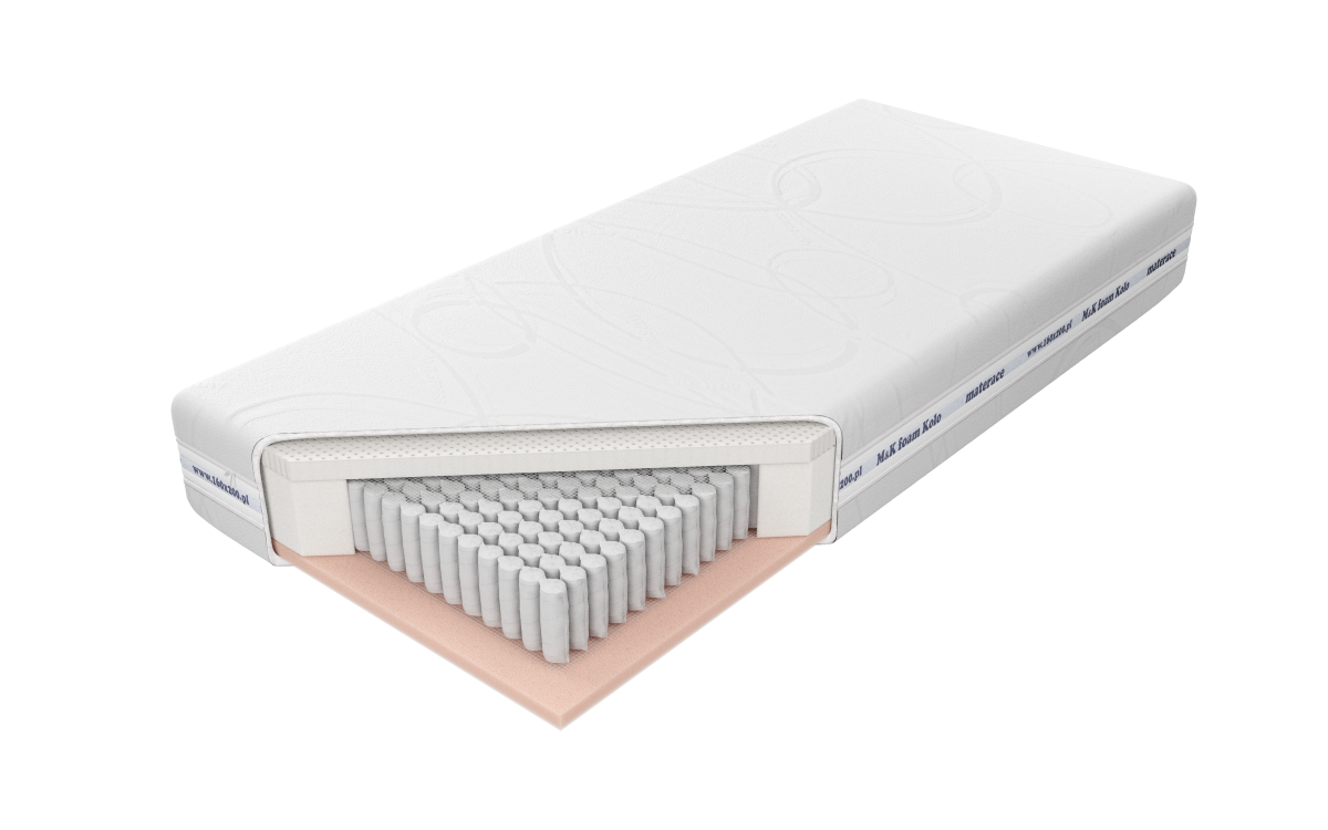 Materac o wysokości ok. 24 cm (w zależności od pokrowca) zbudowany ze sprężyn Punktoflex z wysokogatunkowego drutu, umieszczonych w pojedynczych kieszonkach o średnicy 4 cm. Ilość użytych sprężyn znacząco poprawia elastyczność i zwiększa punktowe podparcie ciała. Zastosowane 18 cm sprężyny wpływają na wyjątkową wysokość i podnoszą przewiewność materaca. Obustronnie w materacu użyta została 2 cm warstwa wytrzymałej, nie odkształcającej się, pianki poliuretanowej. Zastosowana z każdej strony przekładka tapicerska doskonale izoluje, zwiększa twardość i wydłuża żywotność produktu. Istnieje możliwość wyboru twardości materaca, klient decyduje o twardości sprężyn H2 lub H3. Wykorzystanie zamka błyskawicznego, który umożliwia zdjęcie i wypranie pokrowca, znacząco ułatwia utrzymanie go w czystości. Niektóre pokrowce pikowane są 200g / m2, upewnij się u sprzedawcy przed zakupem, jaką gramaturę ma wybrany pokrowiec.
