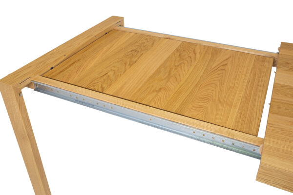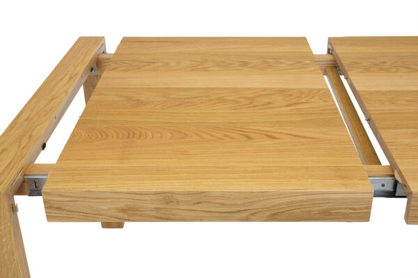Dębowy stół ST399 to imponujący element wyposażenia wnętrz, który łączy solidność z elegancją. Charakteryzuje się prostą, geometryczną bryłą, jego minimalistyczny design sprawia, że stół pasuje do różnorodnych stylów wnętrzarskich, od klasycznych po nowoczesne. Szlachetne usłojenie dębu dodaje wnętrzu naturalnego uroku i ciepła. Niepowtarzalny wygląd i niezwykłą trwałość gwarantuje 2,5 cm blat wykonany z litych lameli dębowych. Dzięki dostawce chowanej pod blat, zmiana wielkości stołu jest szybka i łatwa. To rozwiązanie oszczędza miejsce i pozwala na elastyczność w aranżacji przestrzeni. Jego funkcjonalność i estetyka czynią go nie tylko praktycznym, ale i pięknym elementem każdego salonu, kuchni czy jadalni. Dąb jest znany ze swojej twardości i odporności na uszkodzenia, co sprawia, że meble z niego wykonane mogą służyć przez wiele lat. Sprawdzi się więc doskonale również w salach konferencyjnych, restauracjach lub kawiarniach.