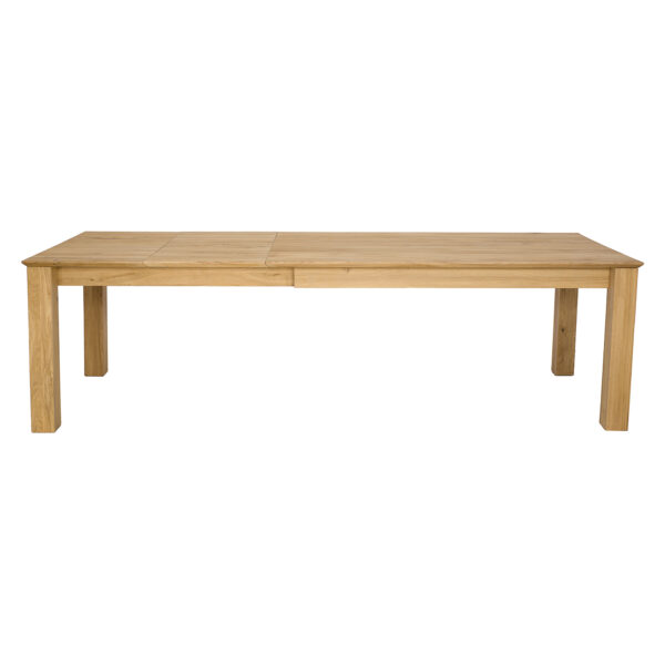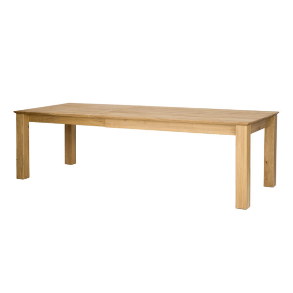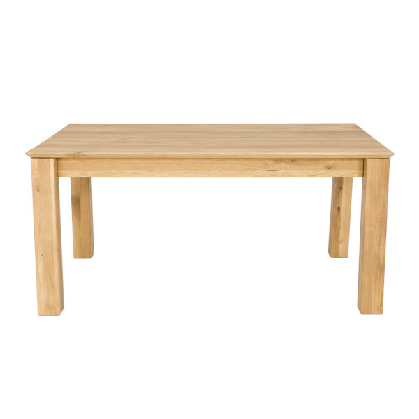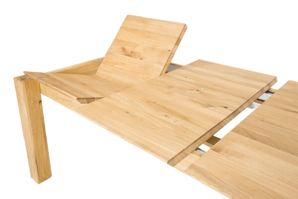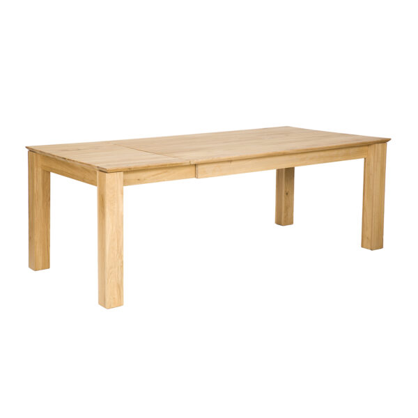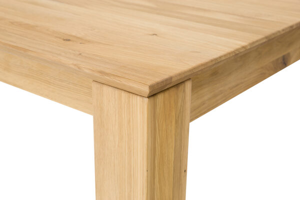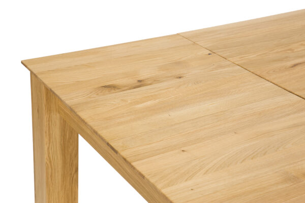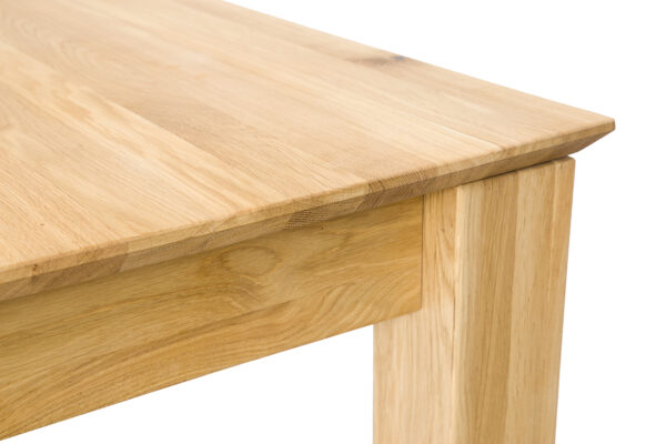 Dębowy stół ST384 to imponujący element wyposażenia wnętrz, który łączy solidność z elegancją. Charakteryzuje się klasyczną bryłą, jego minimalistyczny design sprawia, że stół pasuje do różnorodnych stylów wnętrzarskich, od klasycznych po nowoczesne. Szlachetne usłojenie dębu dodaje wnętrzu naturalnego uroku i ciepła. Niepowtarzalny wygląd i niezwykłą trwałość gwarantuje 2,5 cm blat wykonany z litych lameli dębowych. Dzięki sprytnemu systemowi chowania wkładek pod blat, zmiana wielkości stołu jest szybka i łatwa. To rozwiązanie oszczędza miejsce i pozwala na elastyczność w aranżacji przestrzeni. Jego funkcjonalność i estetyka czynią go nie tylko praktycznym, ale i pięknym elementem każdego salonu, kuchni czy jadalni.