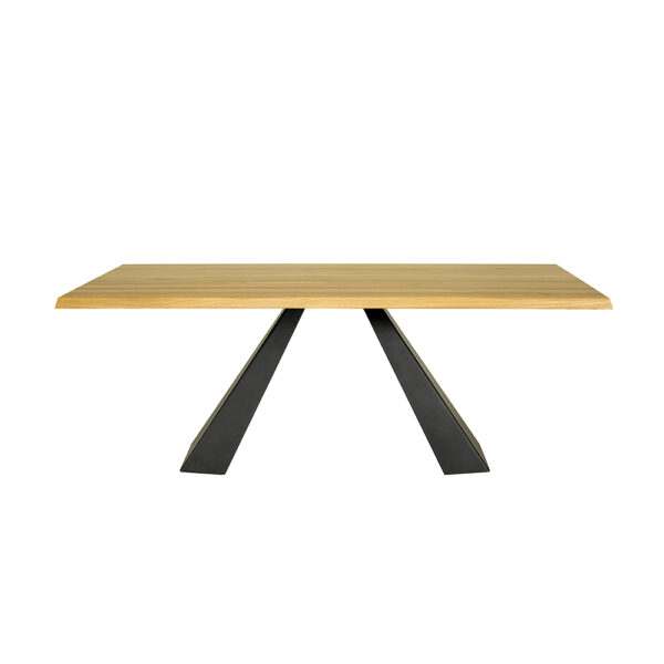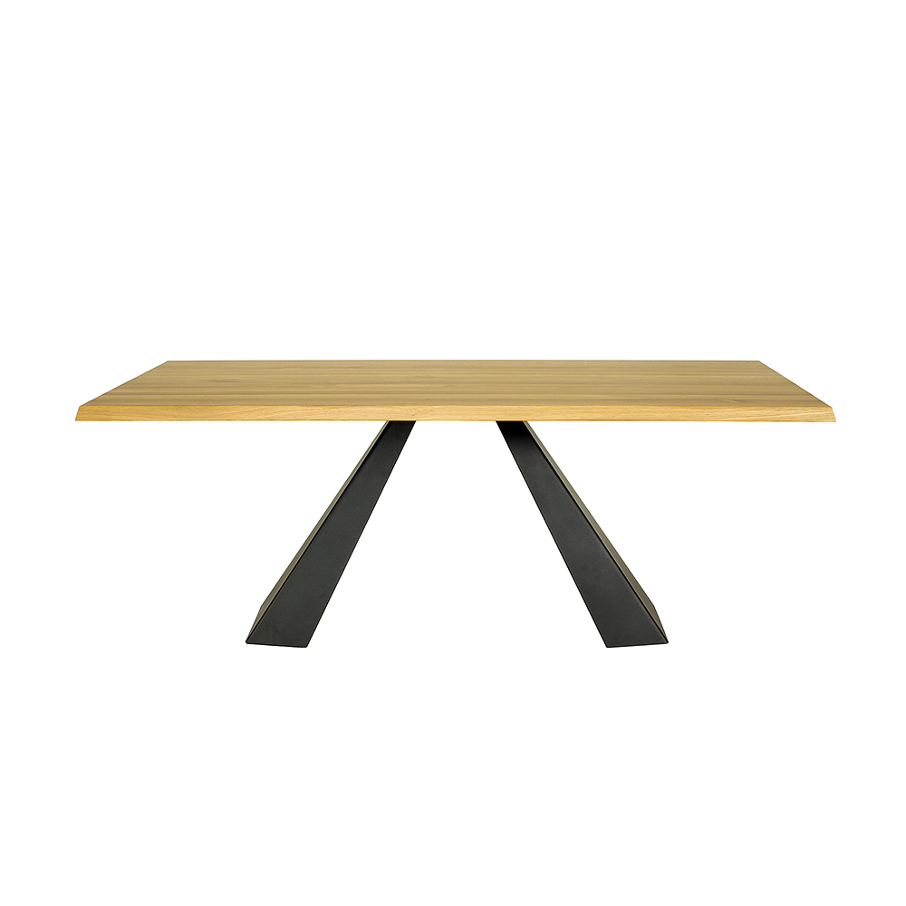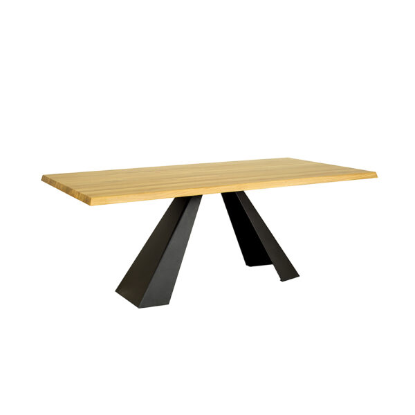 Dębowy stół ST370 z kolekcji Metal to doskonałe połączenie nowoczesnego designu i natury, stanie się on ozdobą każdej jadalni, salonu czy gabinetu, będąc zarówno miejscem do pracy, jak i spotkań towarzyskich. Stół wyróżnia się solidną geometryczną podstawą wykonaną z czarnej stali. Ten nieszablonowy i nowoczesny element zapewnia stabilność i trwałość stołu. Blat o grubości 4 cm wykonany z litych lameli dębowych, eksponuje unikalną strukturę słojów, wprowadza do wnętrza ciepło i elegancję.