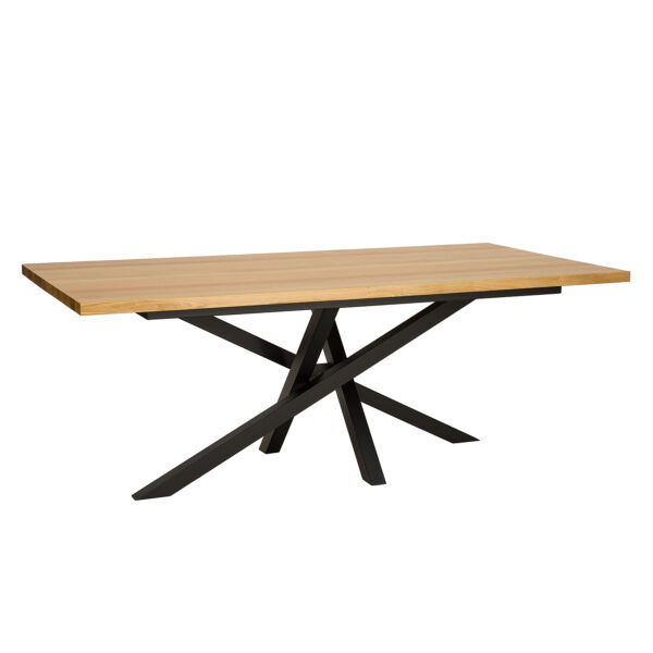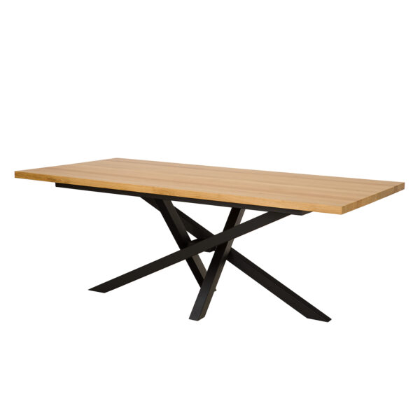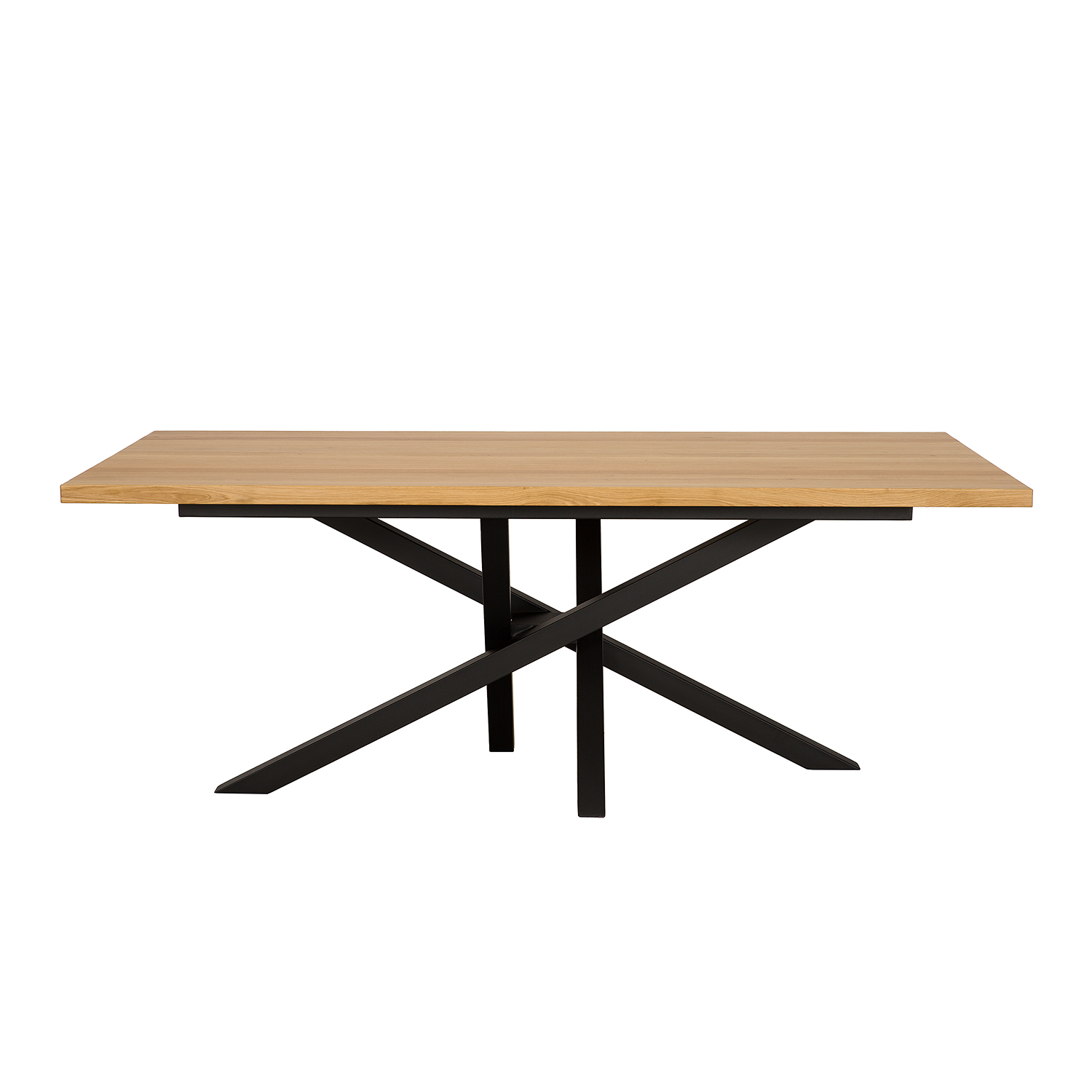 Dębowy stół ST377 z kolekcji Metal to unikatowe połączenie nowoczesnego designu i natury, stanie się on ozdobą każdej jadalni, salonu czy gabinetu, będąc zarówno miejscem do pracy, jak i spotkań towarzyskich. Stół wyróżnia się starannie zaprojektowanymi, krzyżującymi się nogami tupu "pająk" wykonanymi z czarnej stali. Ten elegancki i nowoczesny element dodaje mu lekkości i dynamizmu, zachowując jednocześnie stabilność i trwałość. Blat o grubości 4 cm wykonany z litych lameli dębowych, eksponuje unikalną strukturę słojów, wprowadza do wnętrza ciepło i elegancję.