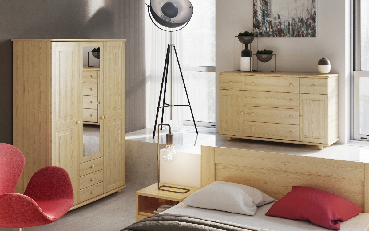 Sosnowa szafa SF110 to idealne rozwiązanie do przechowywania zarówno w sypialni, jak i przedpokoju czy garderobie. Charakteryzuje się naturalnym, ciepłym wyglądem, który doskonale wpasowuje się w różnorodne style wnętrzarskie – od klasycznych, przez skandynawskie, aż po nowoczesne. Drzwiczki wyposażone w duże lustro, nie tylko dodają elegancji, ale także optycznie powiększa przestrzeń. Wnętrze szafy zostało zaprojektowane z myślą o maksymalnej funkcjonalności, jedna z części skrywa przestronne półki, oferujące dużo miejsca do przechowywania odzieży, pościeli czy innych domowych akcesoriów. Szeroki drążek, pozwala wygodnie przechowywać ubrania, zapobiegając ich zagnieceniom. Trzy praktyczne szuflady, oferują mnóstwo miejsca na drobniejsze przedmioty, takie jak bielizna czy dokumenty. Fronty szafek są ozdobione wyraźnymi frezami, które dodają całemu meblowi elegancji i unikalnego charakteru. Ten detal sprawia, że komoda staje się również wyjątkowym elementem dekoracyjnym wnętrza. Szafa transportowana w paczkach do montażu.